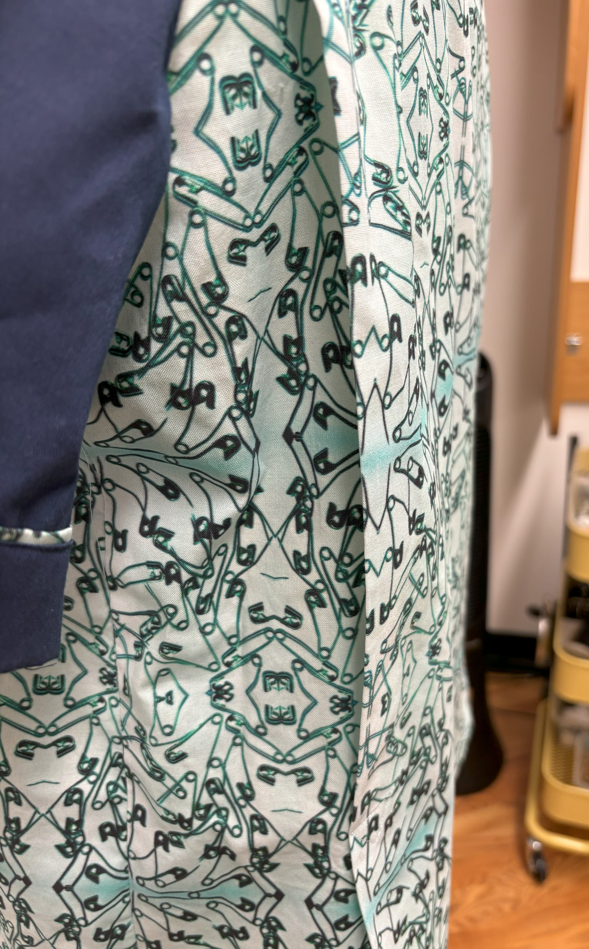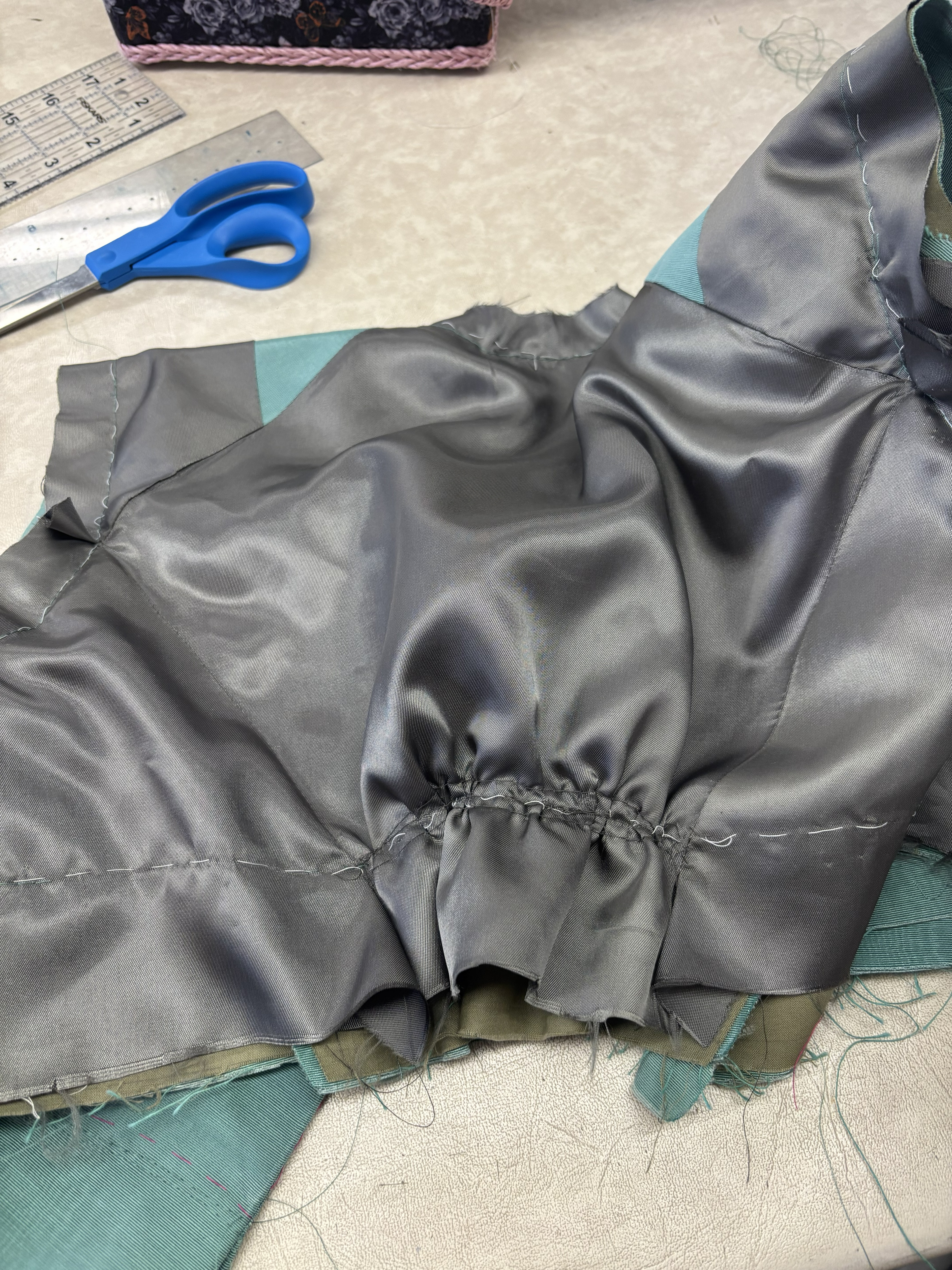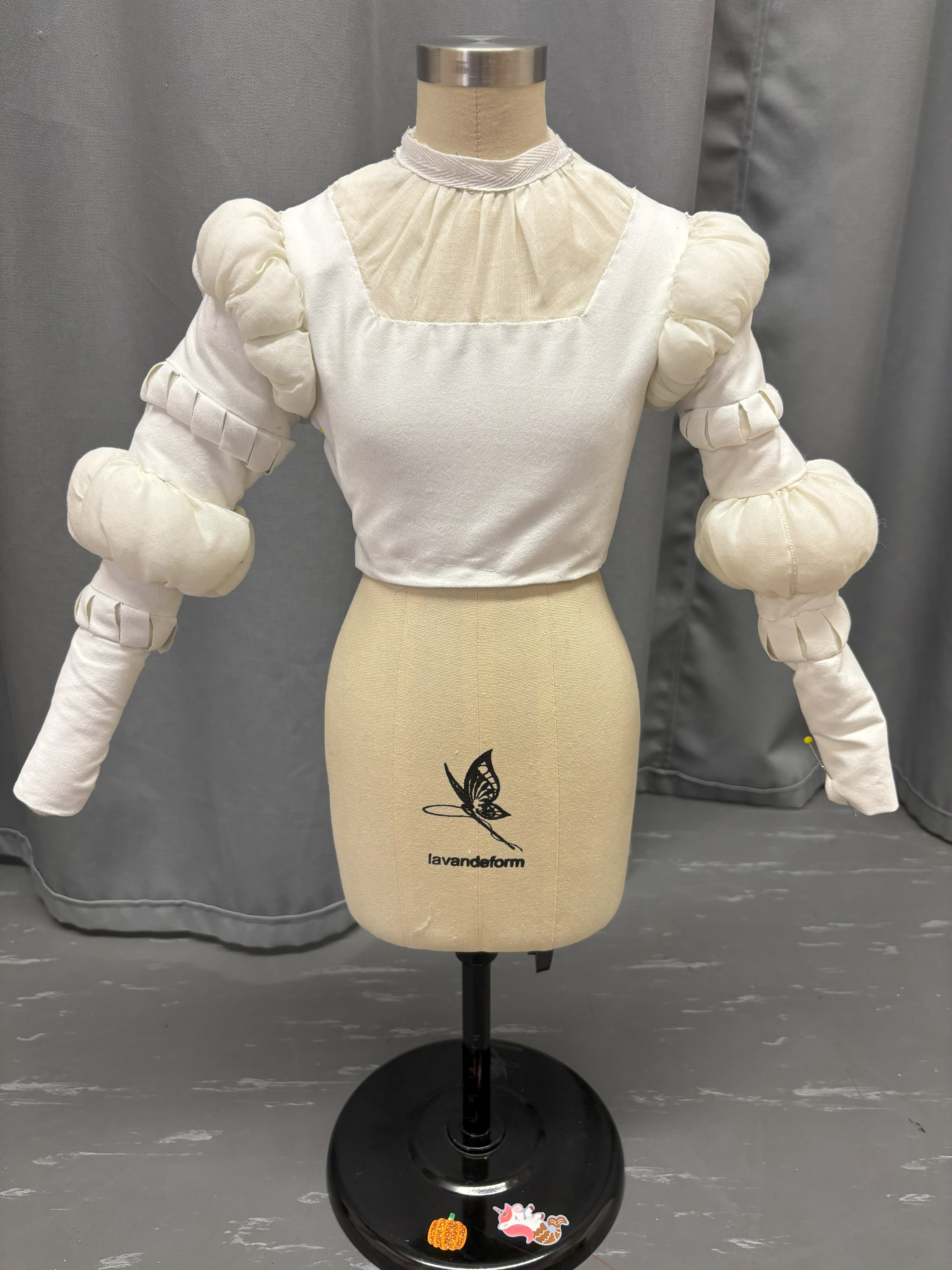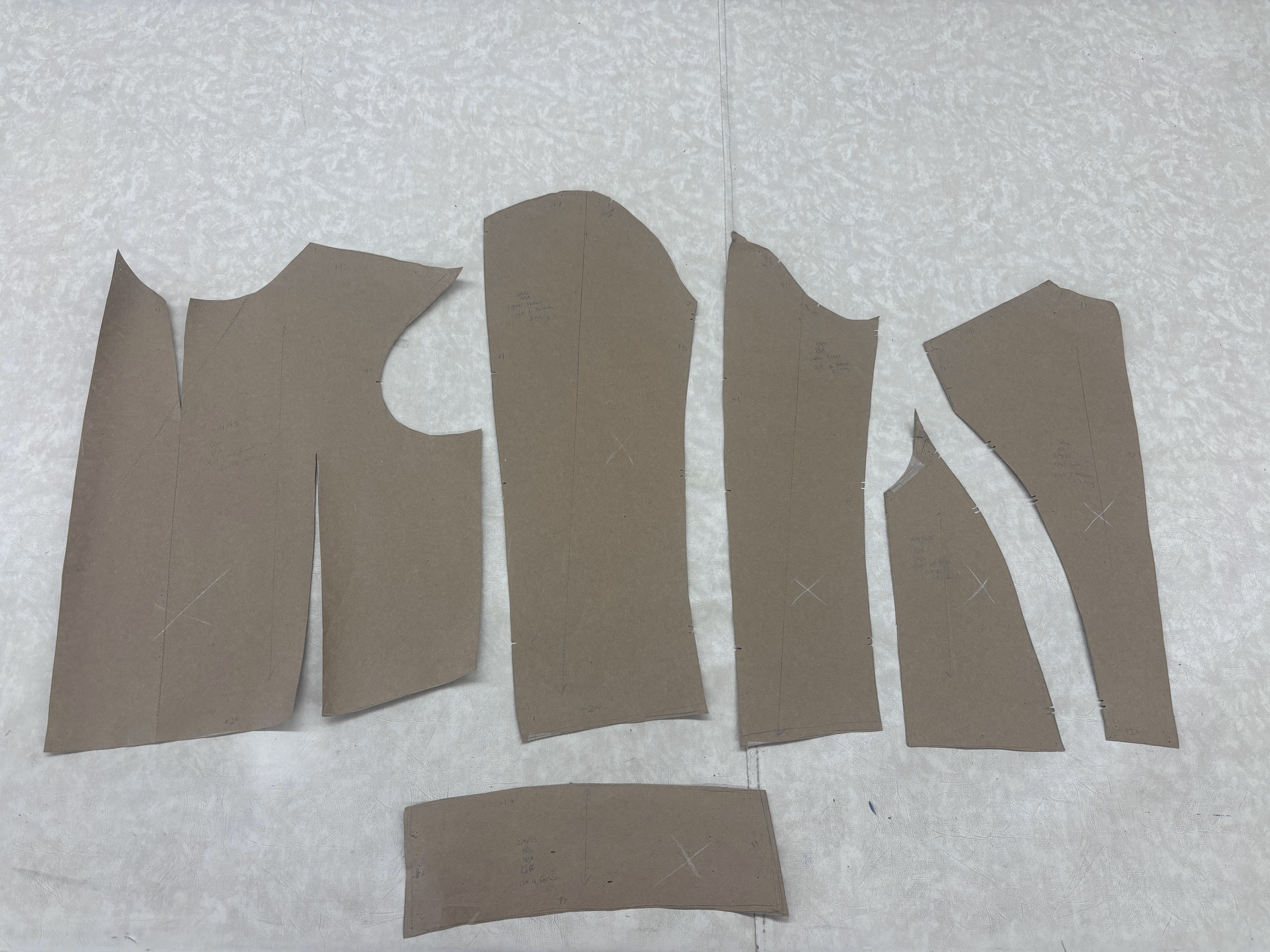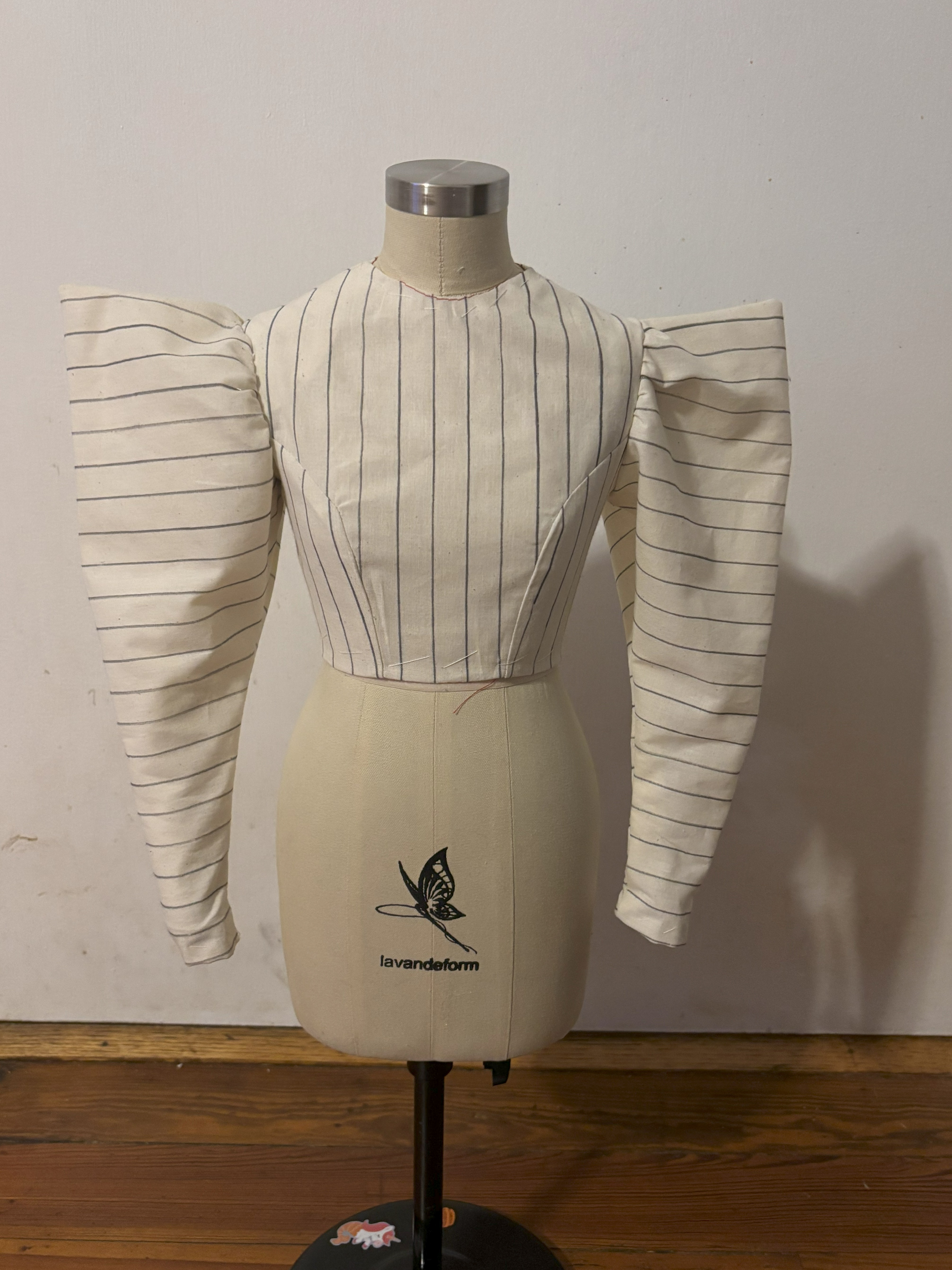 This was an exercise in patterning sleeves, and the goal was to match the picture as best as we could. I ended up patterning the sleeve similar to a leg of mutton, but the top gets sewn together at the top to make the point before it’s set in.