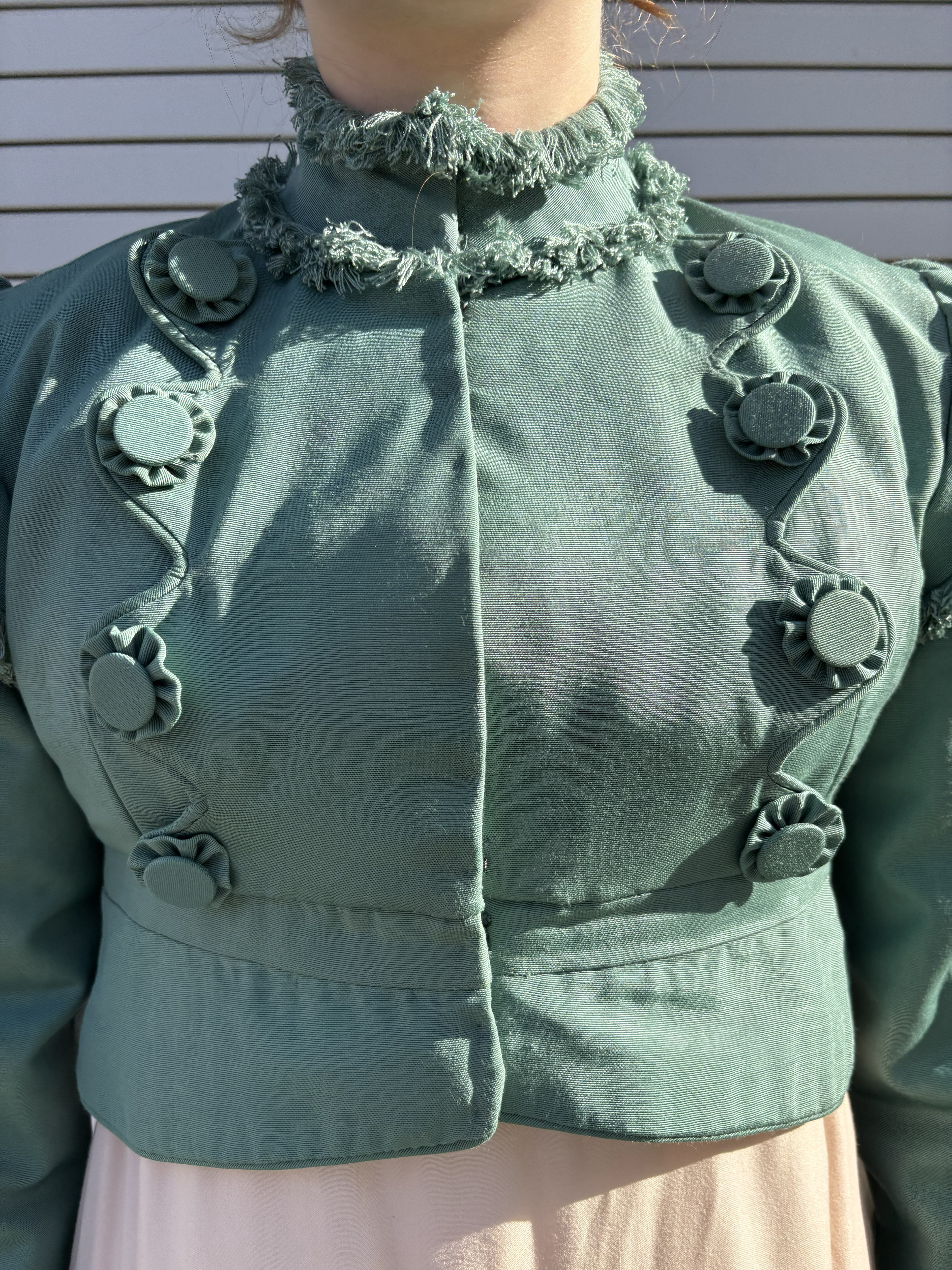 For this project, we had to pattern a shirtwaist from 1914 based on a catalog photo. I made a mock-up and made some corrections. One challenge of this project was that none of the insides could be serged. It had to be alternatives, so I chose Hong Kong finishes using seam binding. To keep the waist cinched, elastic was used.