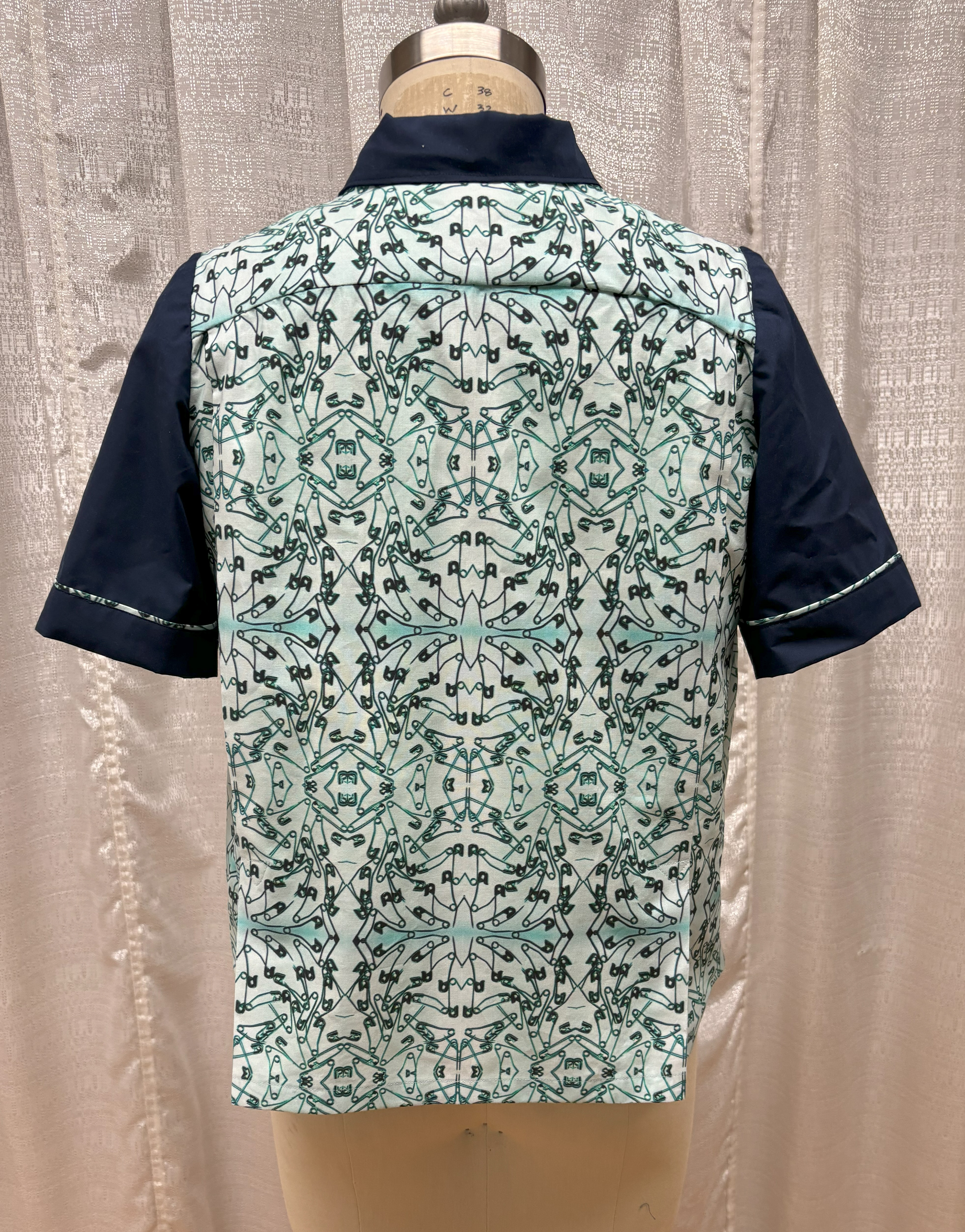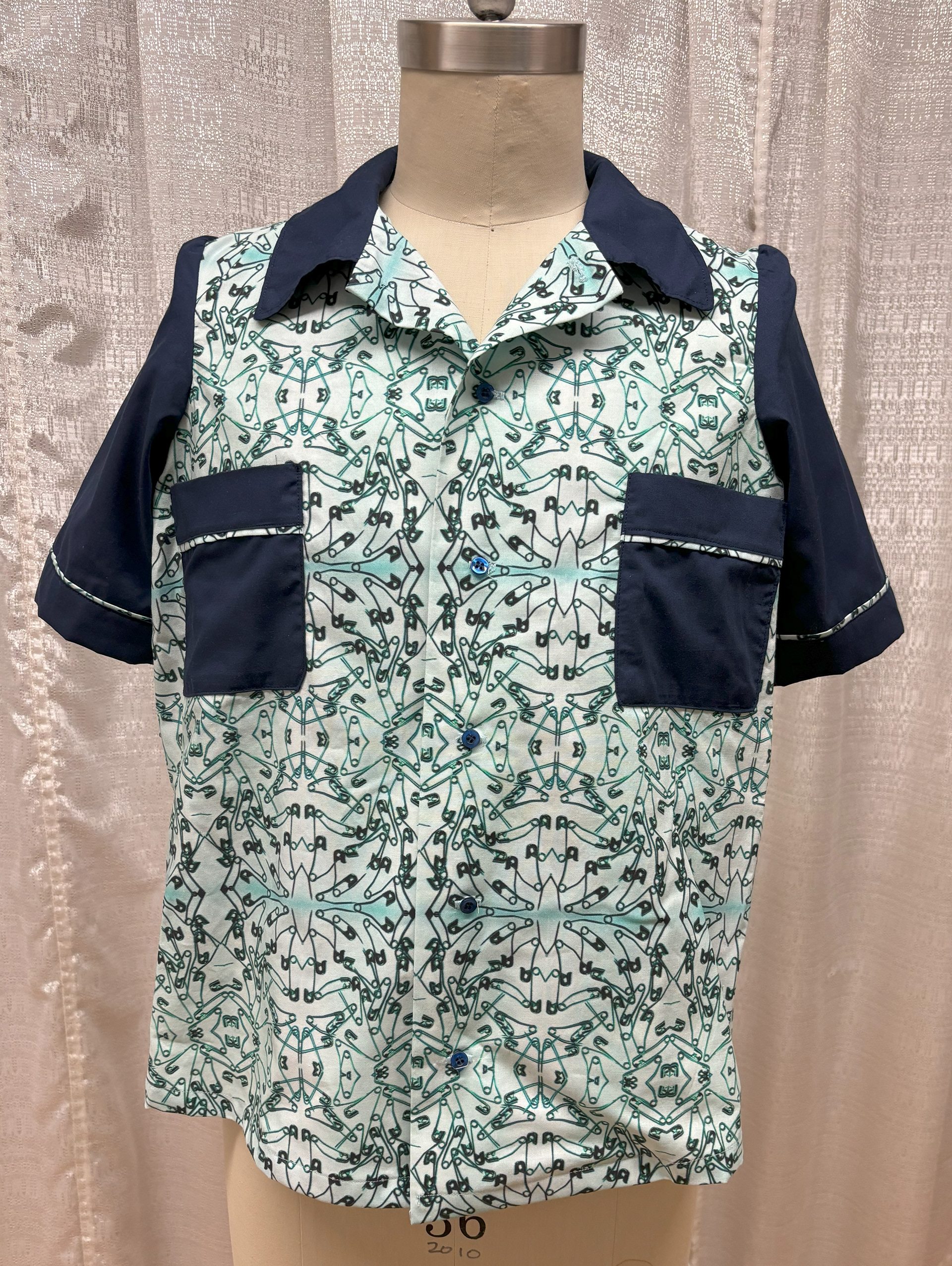For this project, we had to pattern a shirt either in a different size or the same size as the shirt we were shown. I chose to pattern it in a different size. There was also a focus on making sure our center front and back yoke were pattern matched. The front had a facing built, which also acted as a facing for the front of the collar. The yoke had two layers, one acting as a facing, so the shoulders and yoke seam were encased. The only serged edges seen in the garment are those of the side seams and sleeves.