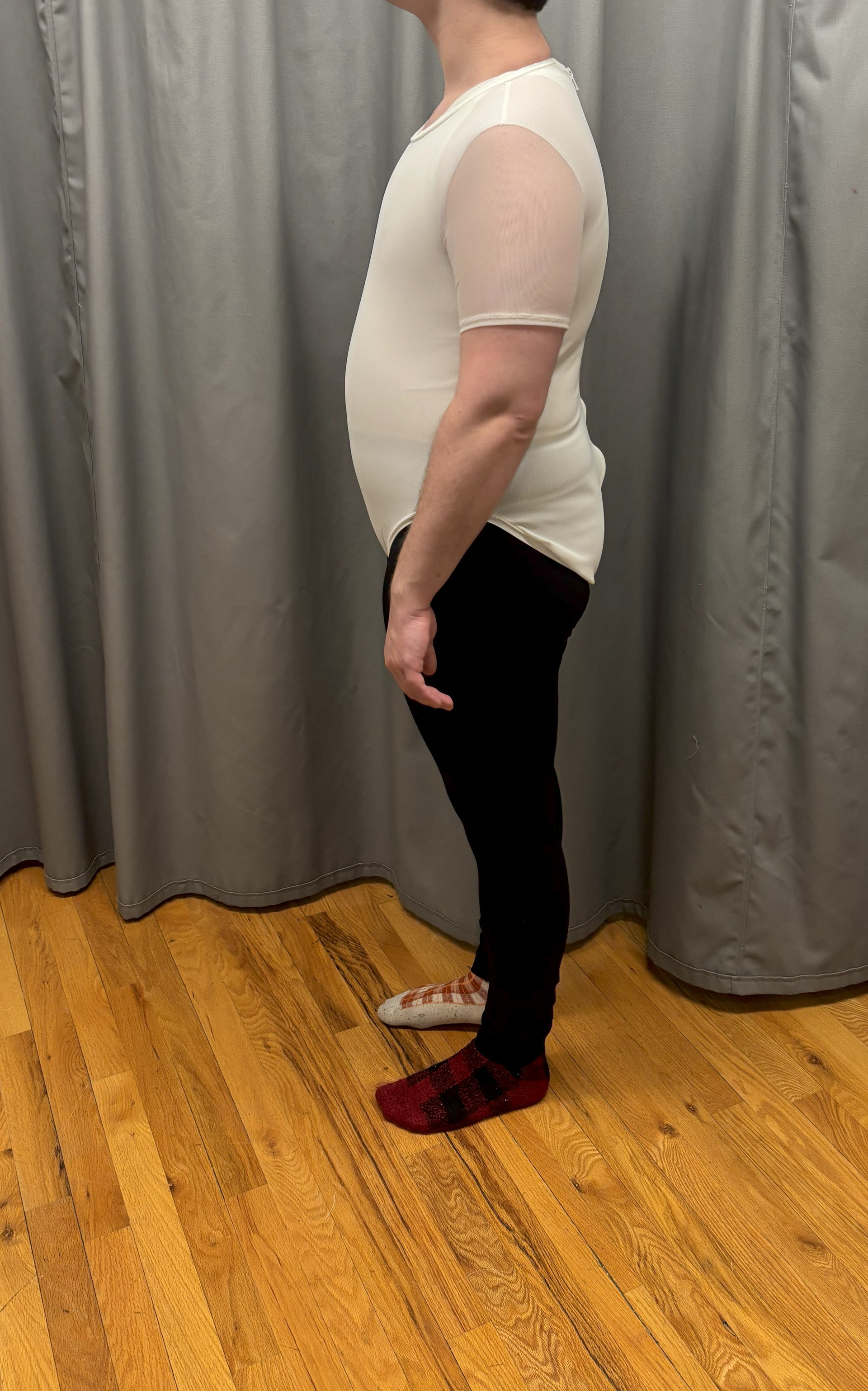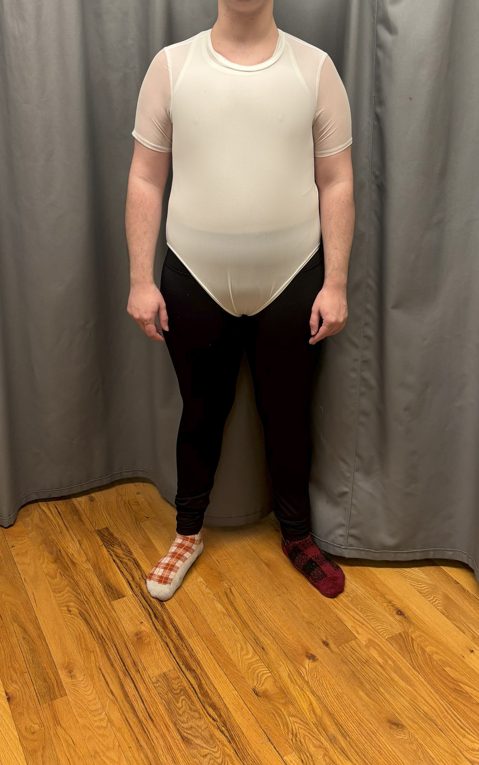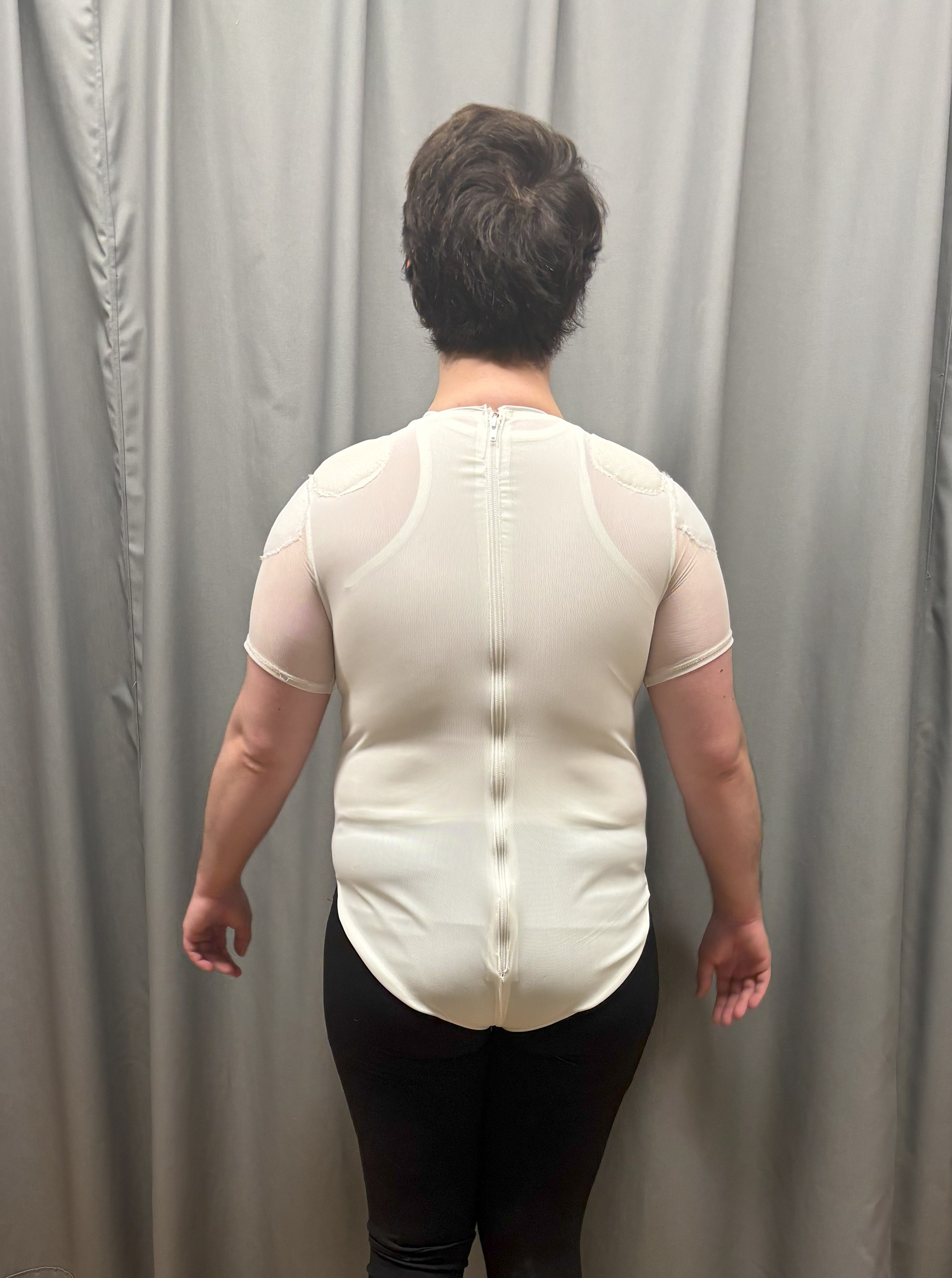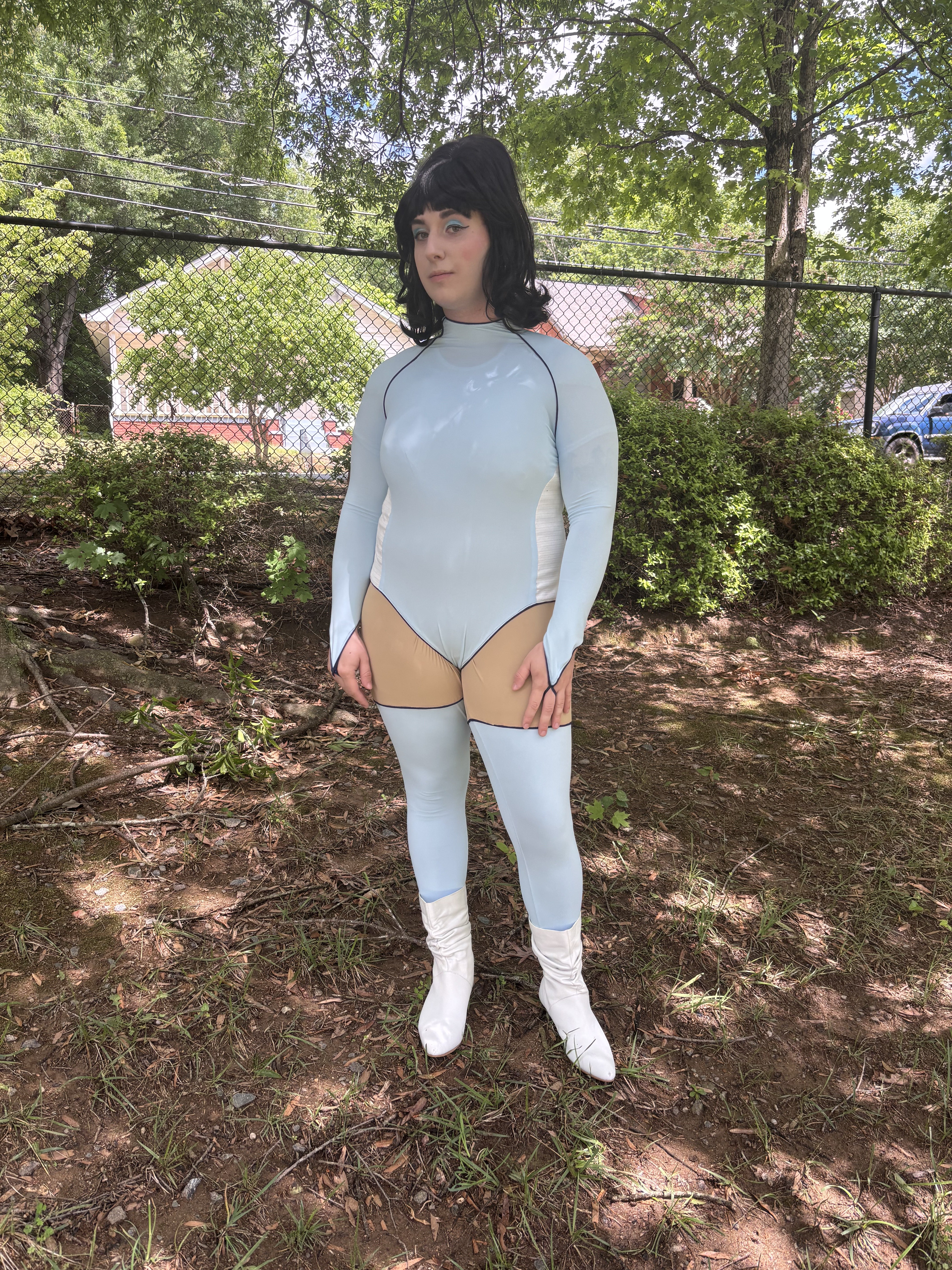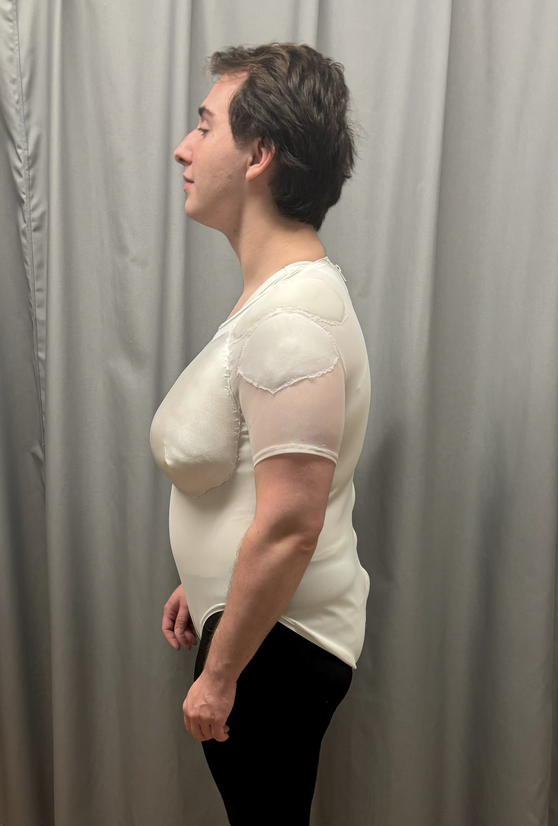 The foundation is made of power mesh, the body is a heavier weight, and the sleeves are a lighter weight. The shoulder modifications are made with heavy sports mesh. The chest is made of latex foam with a layer of cotton batting and then spandex over it.