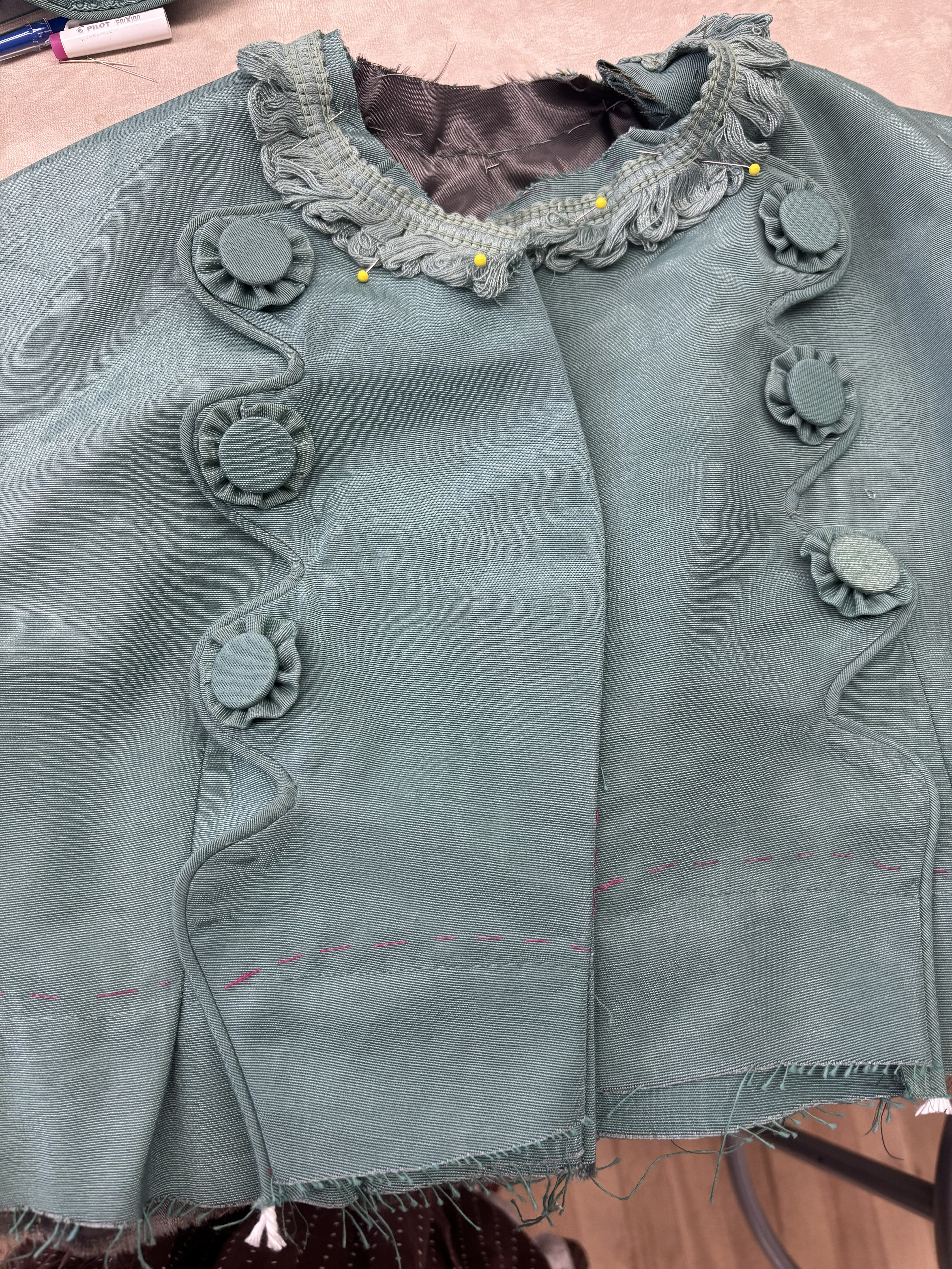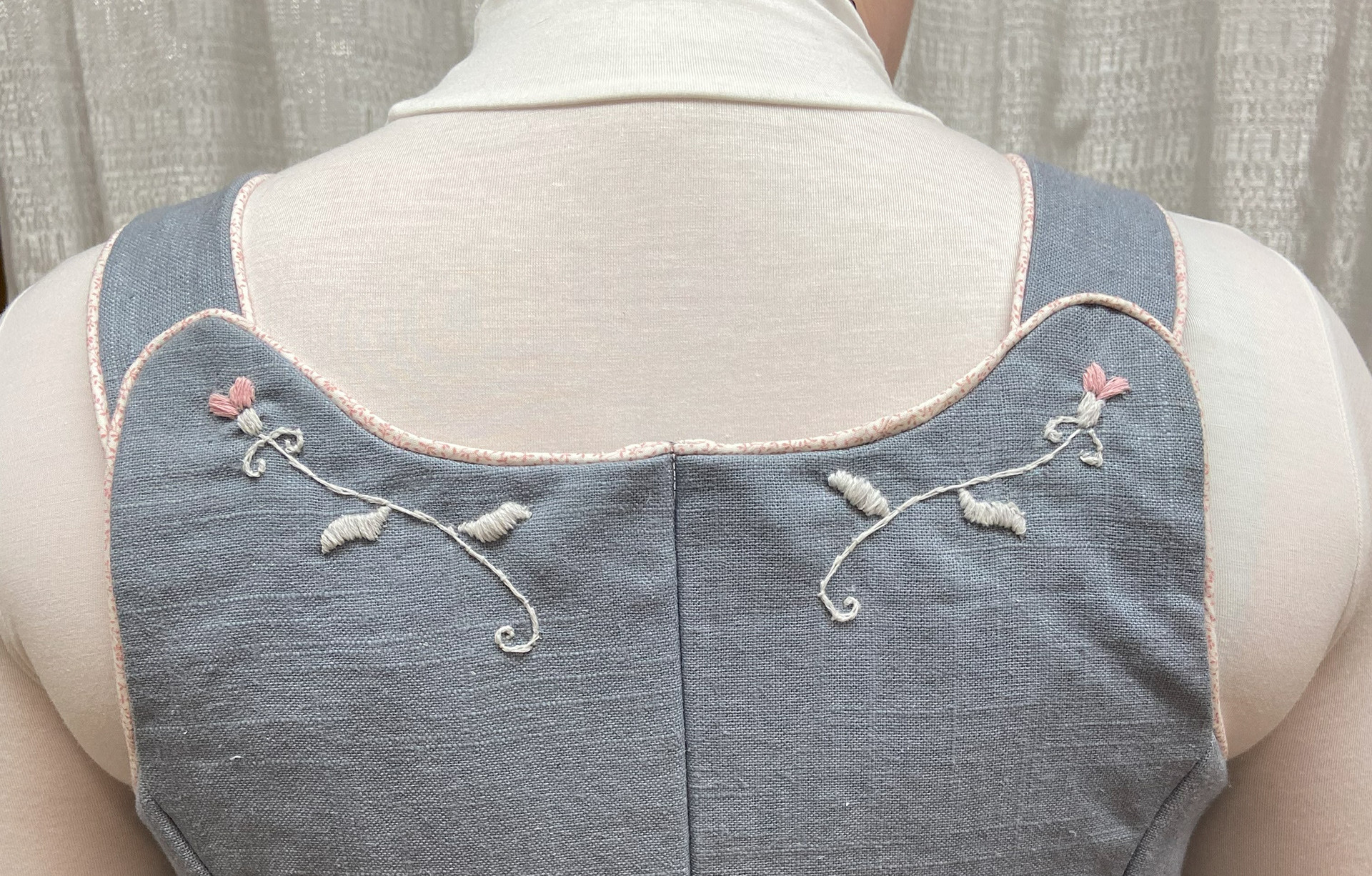 The bodice was required to be draped. I was given a sketch of a boned bodice and padded a mannequin to match the model’s measurements. After the fitting, I transferred the corrections onto the paper patterns. The bodice itself was finished with a combination of piping and bias tape, where one side of the bias tape is folded and the other is piping. The closures were sewn on, and then the embroidery was sewn on.