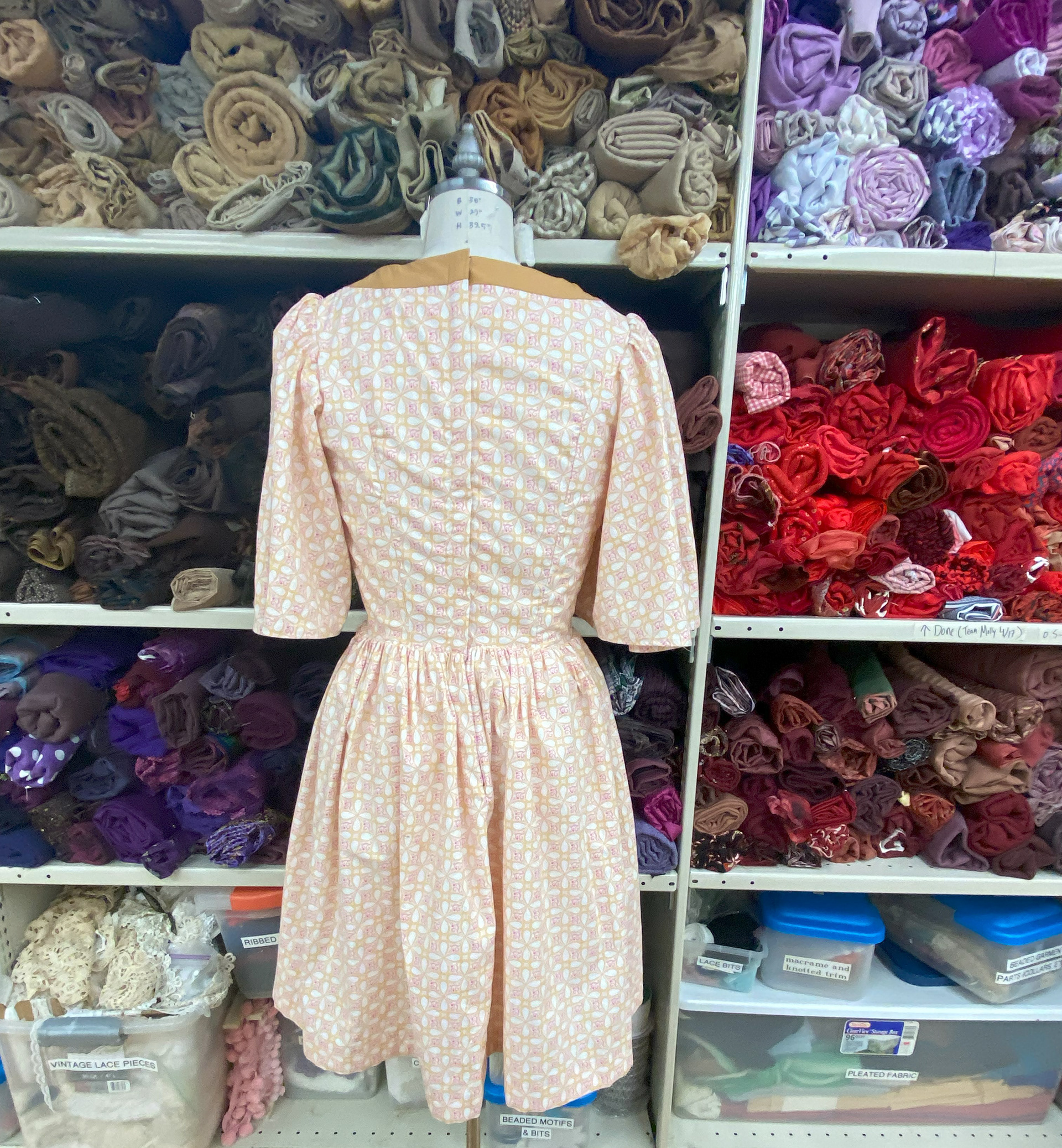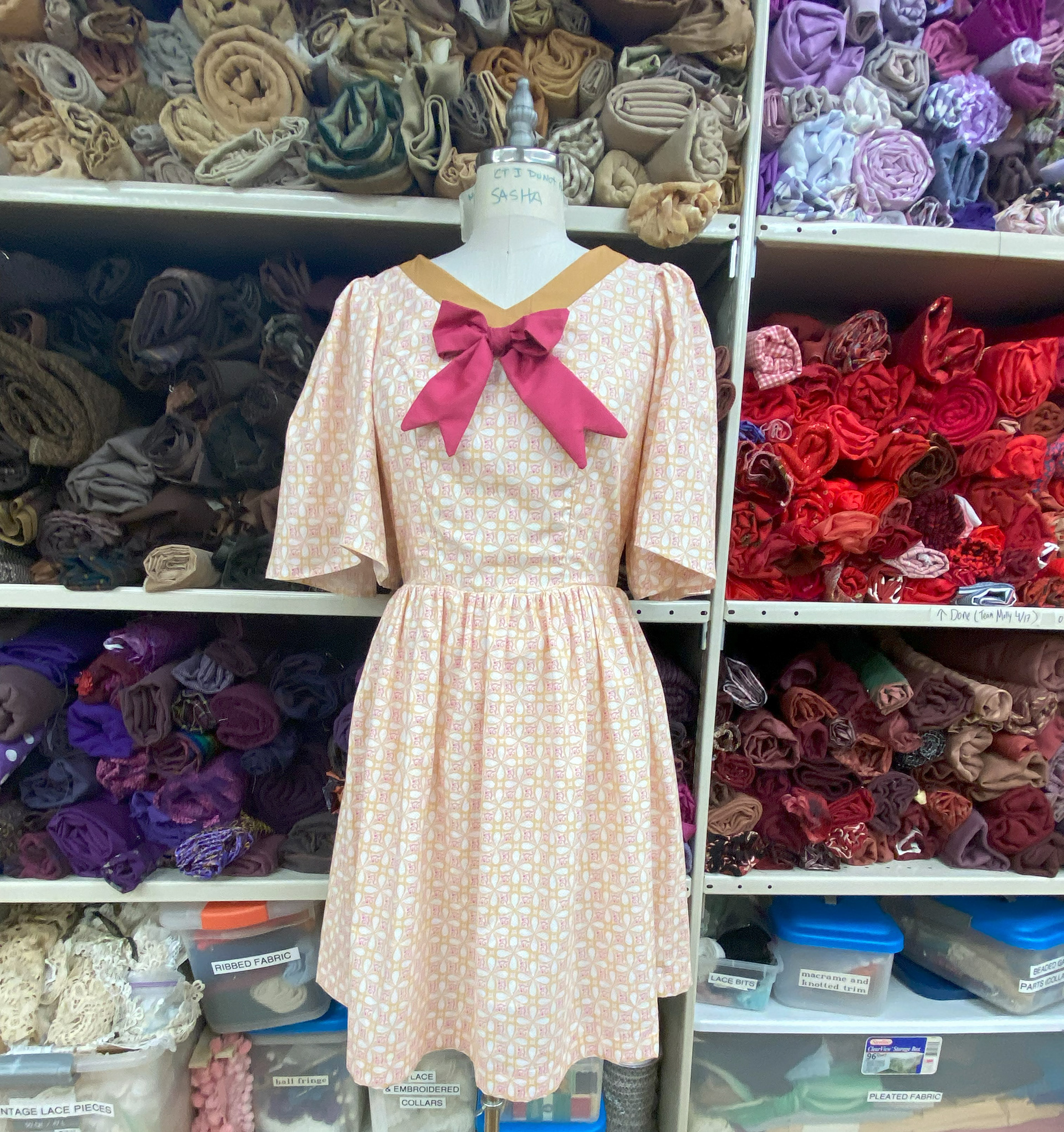 For the patterned dress, we first did a ½ mockup to get the feel for how to make it and get the design lines right. Then I took the blocks and modified them to be the style of the sketch given. The bodice pieces were flatlined and then sewn together, and the sleeves were put on. The skirt was sewn on, and then the neck facing was attached to finish off the edges. The bow was hand-stitched on.