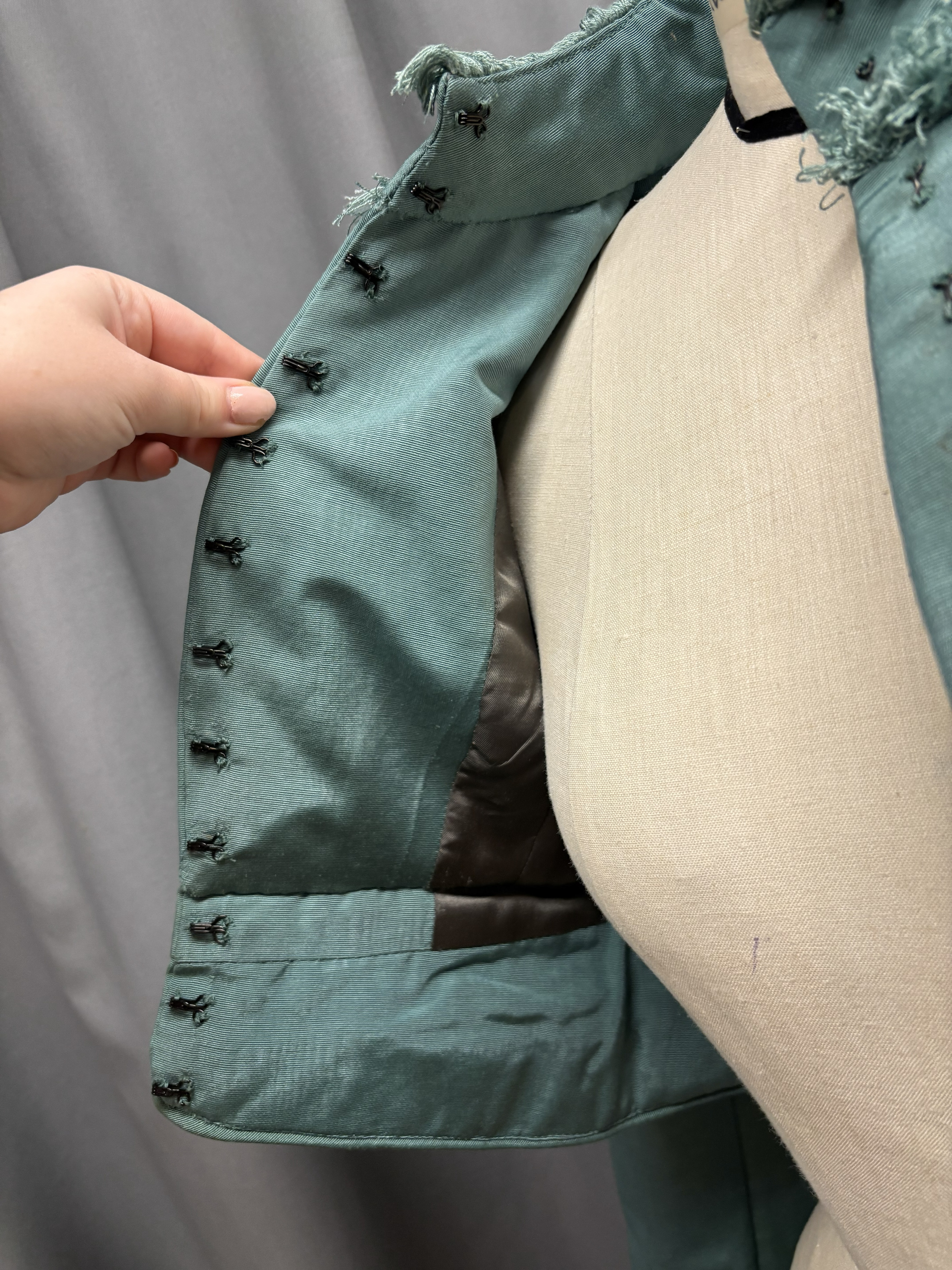 I flat-patterned the pants and a vest. After the mock-up, the pants fit corrections were made, and then they were turned into breeches. The vest was also flat-patterned. vest and made a canvas mock-up of the vest. After some fit corrections were made. The tabs are sewn in after the fronts and backs are bagged out, and the sides and shoulders are sewn together.