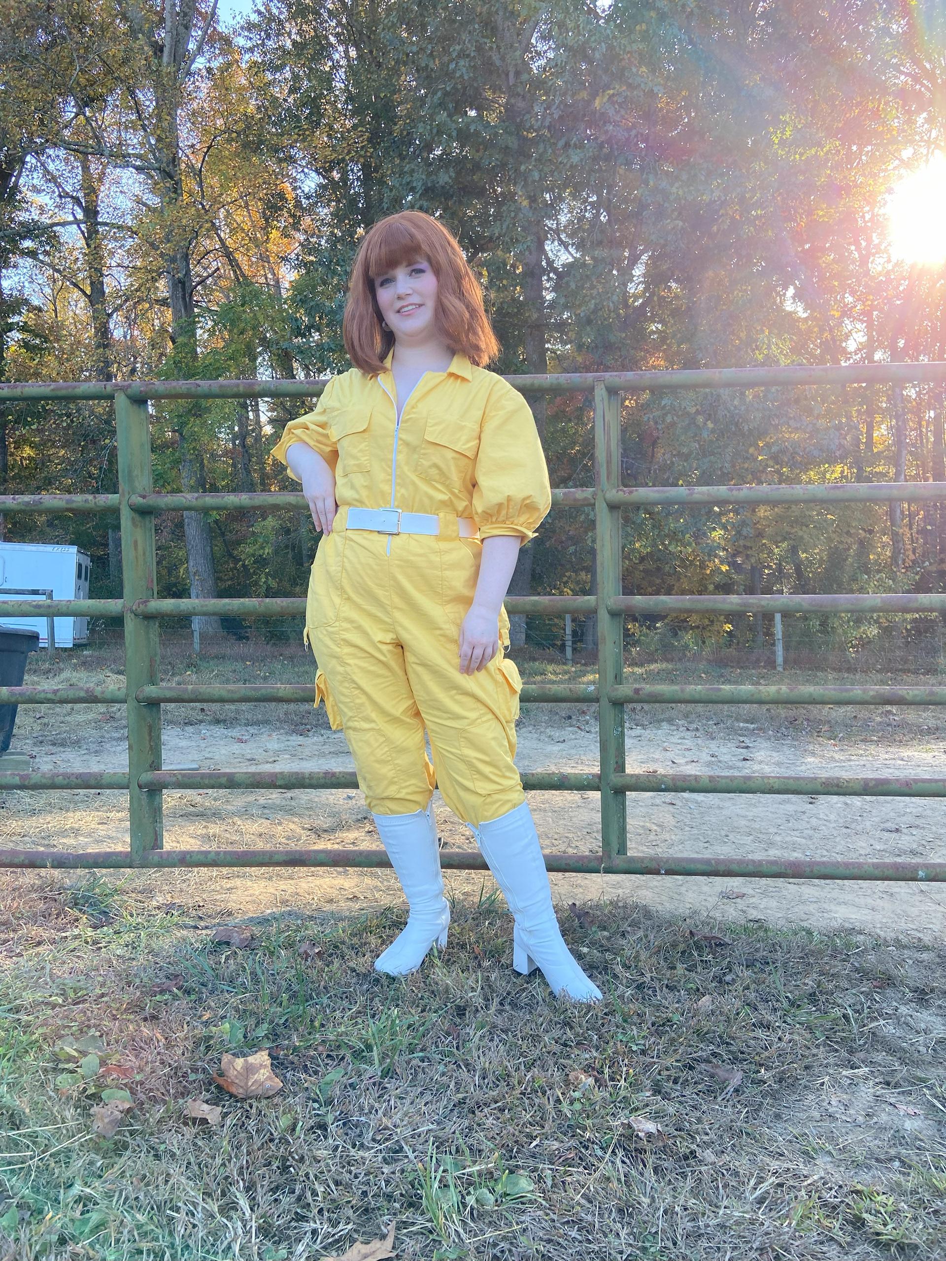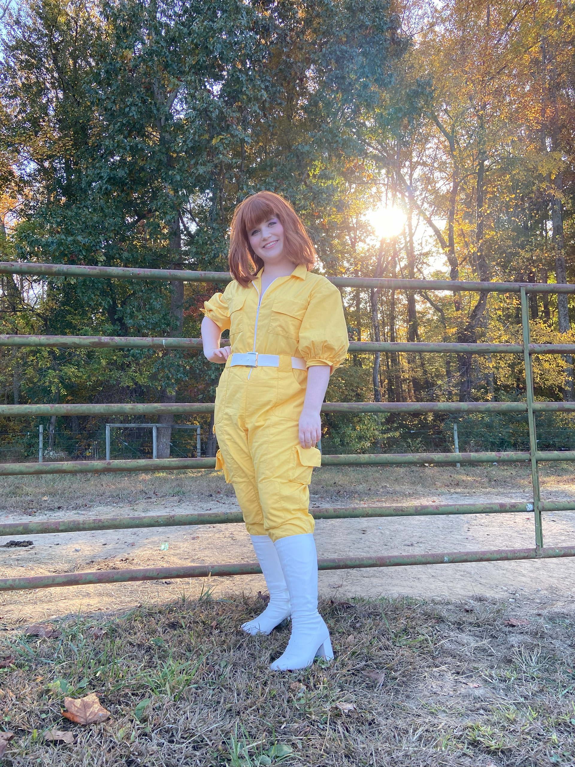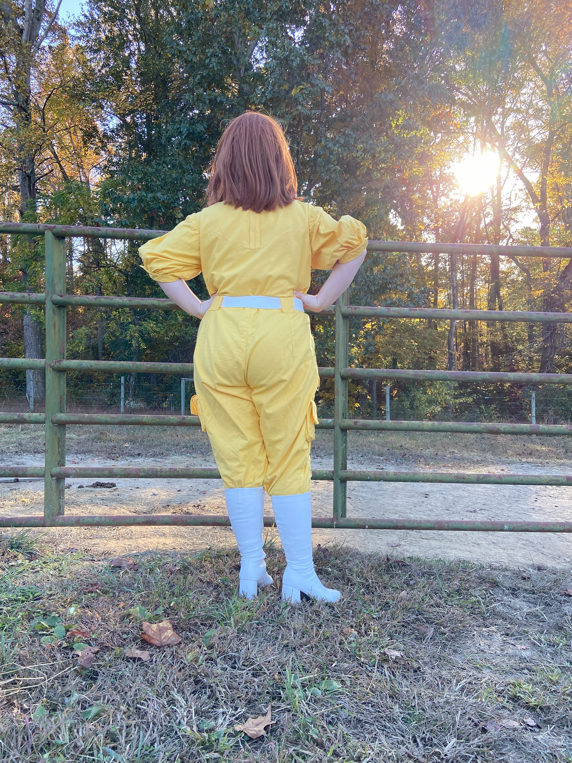For this costume, I used a free pattern from Mood as a base, as I don’t have much experience patterning jumpsuits. I flatlined the pants as the material was thin, and I wanted the yellow to pop.