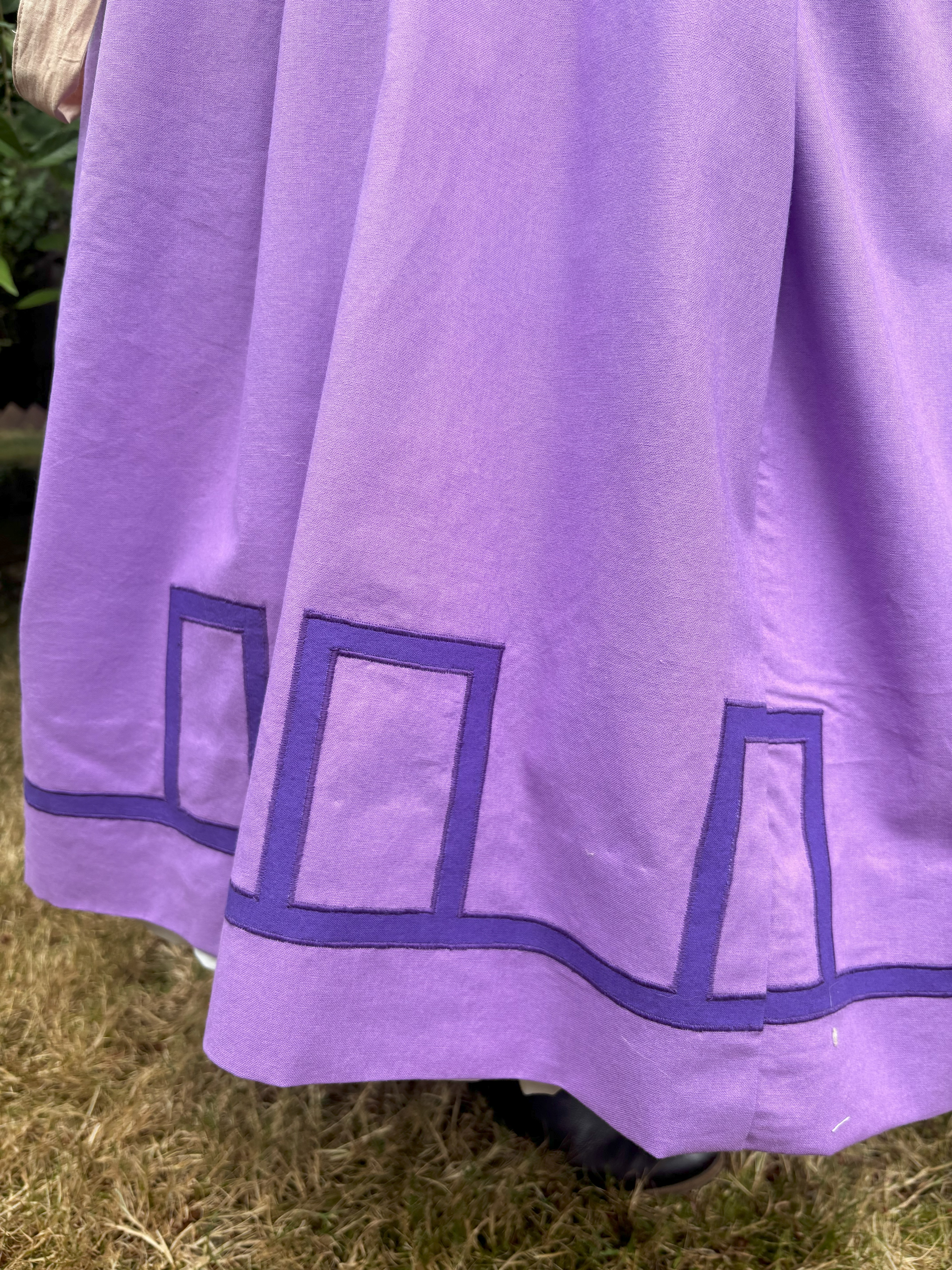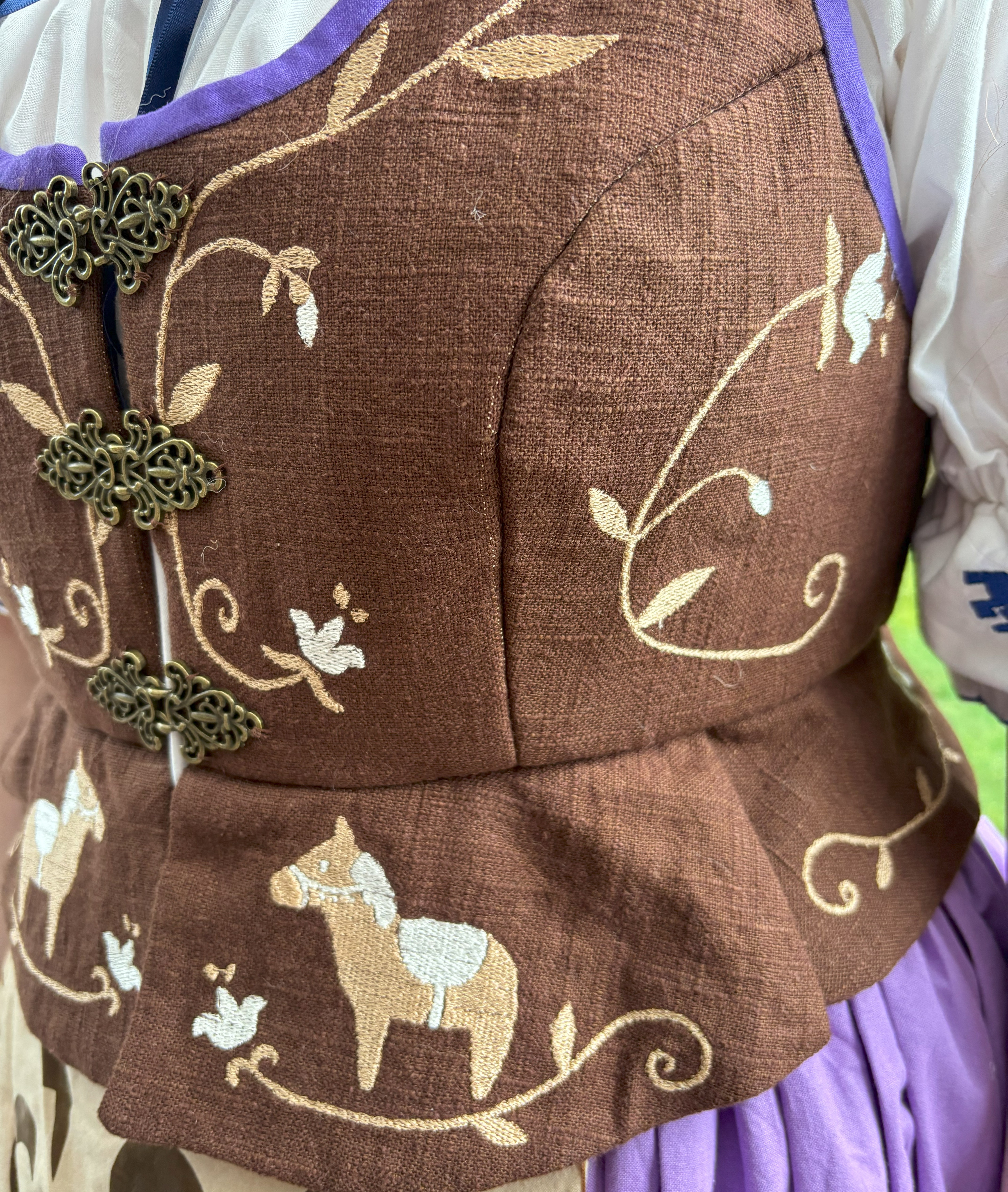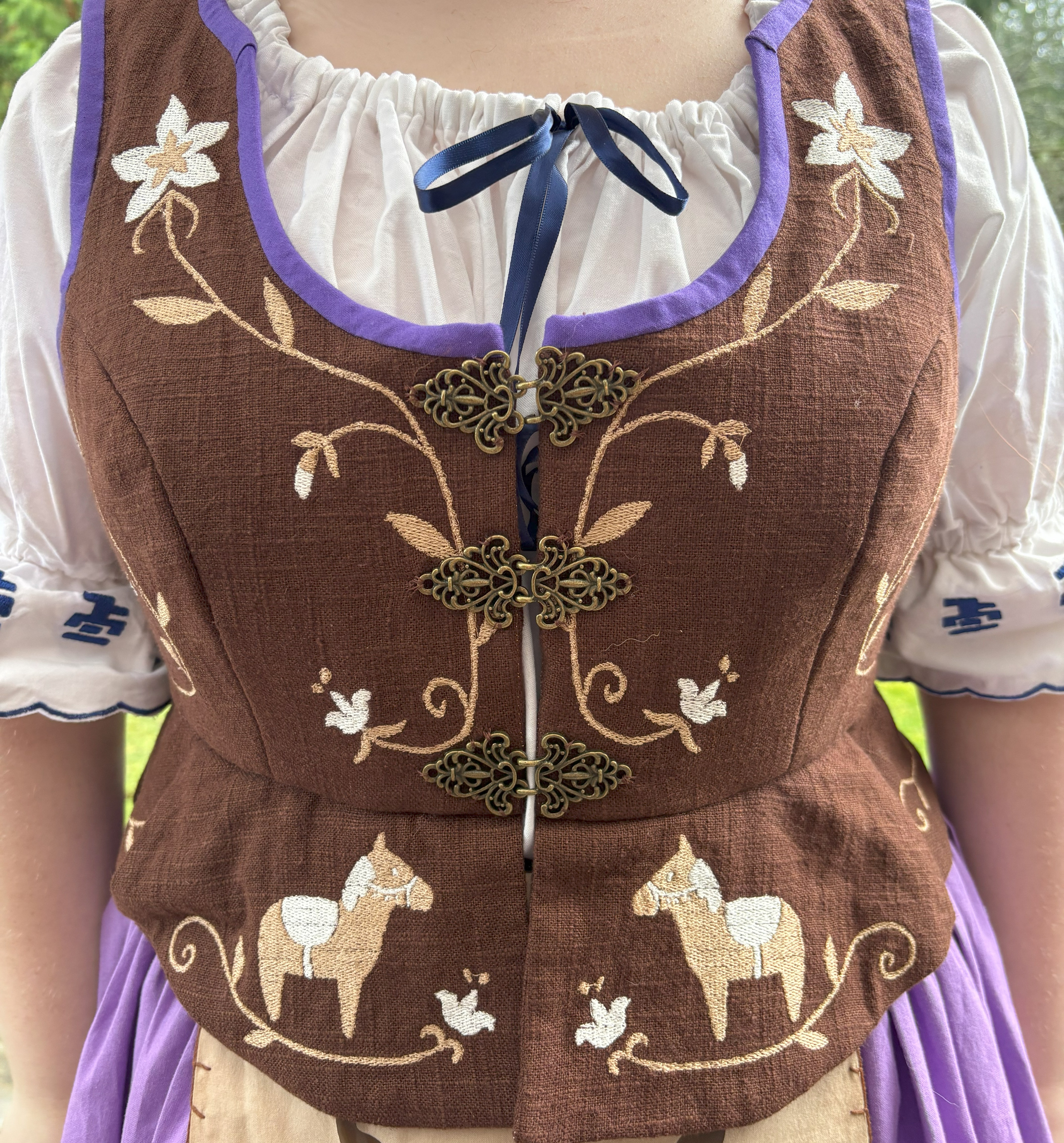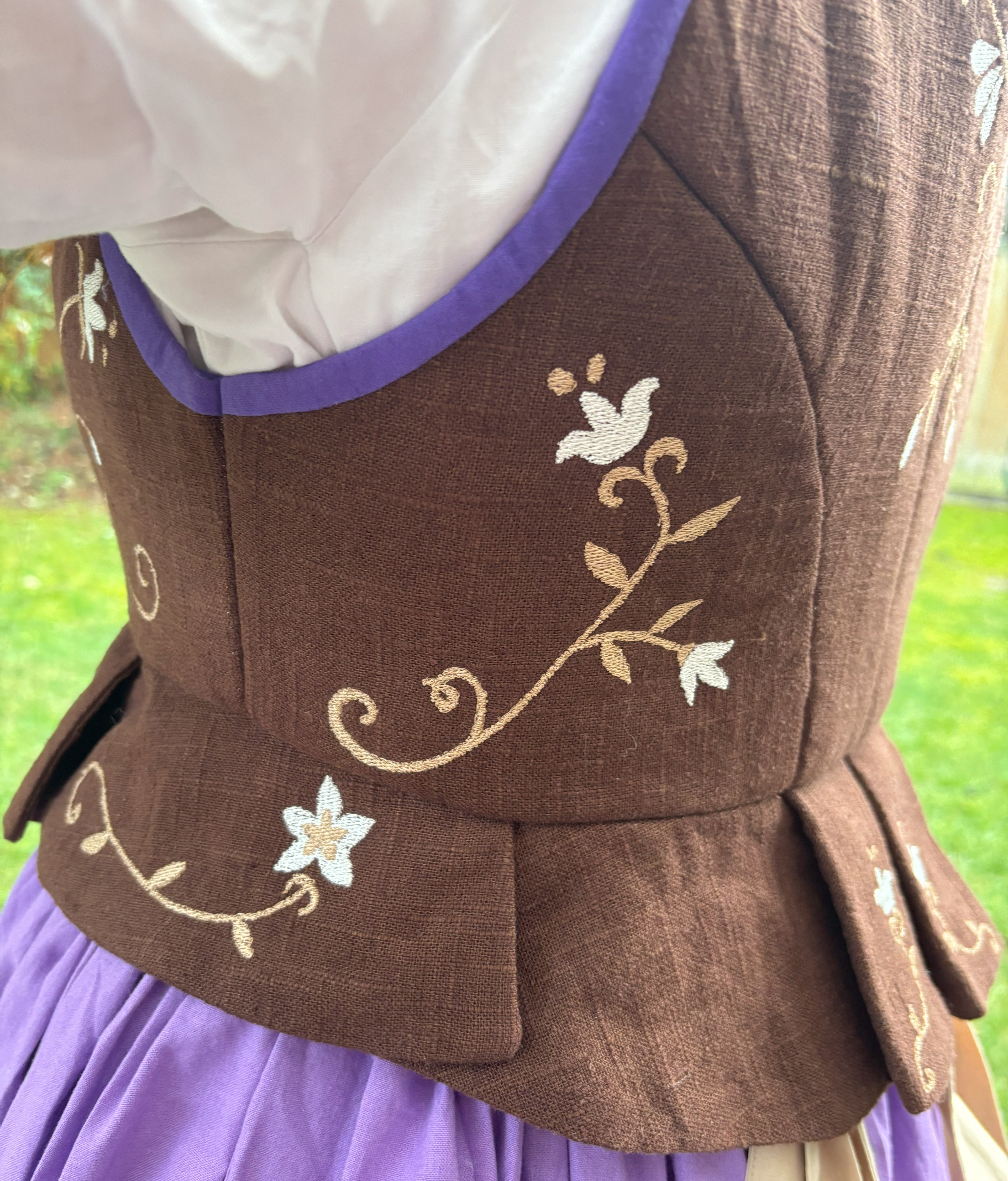 I made a body block of my corseted measurements and converted it into a stay pattern by referencing pictures of the garments and pictures of pattern pieces. The chemise was sewn out of fashion fabric to start with, as well as the petticoat. The tucks were thread-traced and then stitched. For the design of the skirt, I used Heat and Bond light on cotton and satin, stitched around the edges. I used a Cricut to design and cut out the shapes to keep them more consistent. For the apron, I used iron-on vinyl and drew and cut it out with the Cricut. I used a program called Inkstitch to make an embroidery file and did a test on scrap fabric. When it went well, I moved to the final and added them to the sleeves.