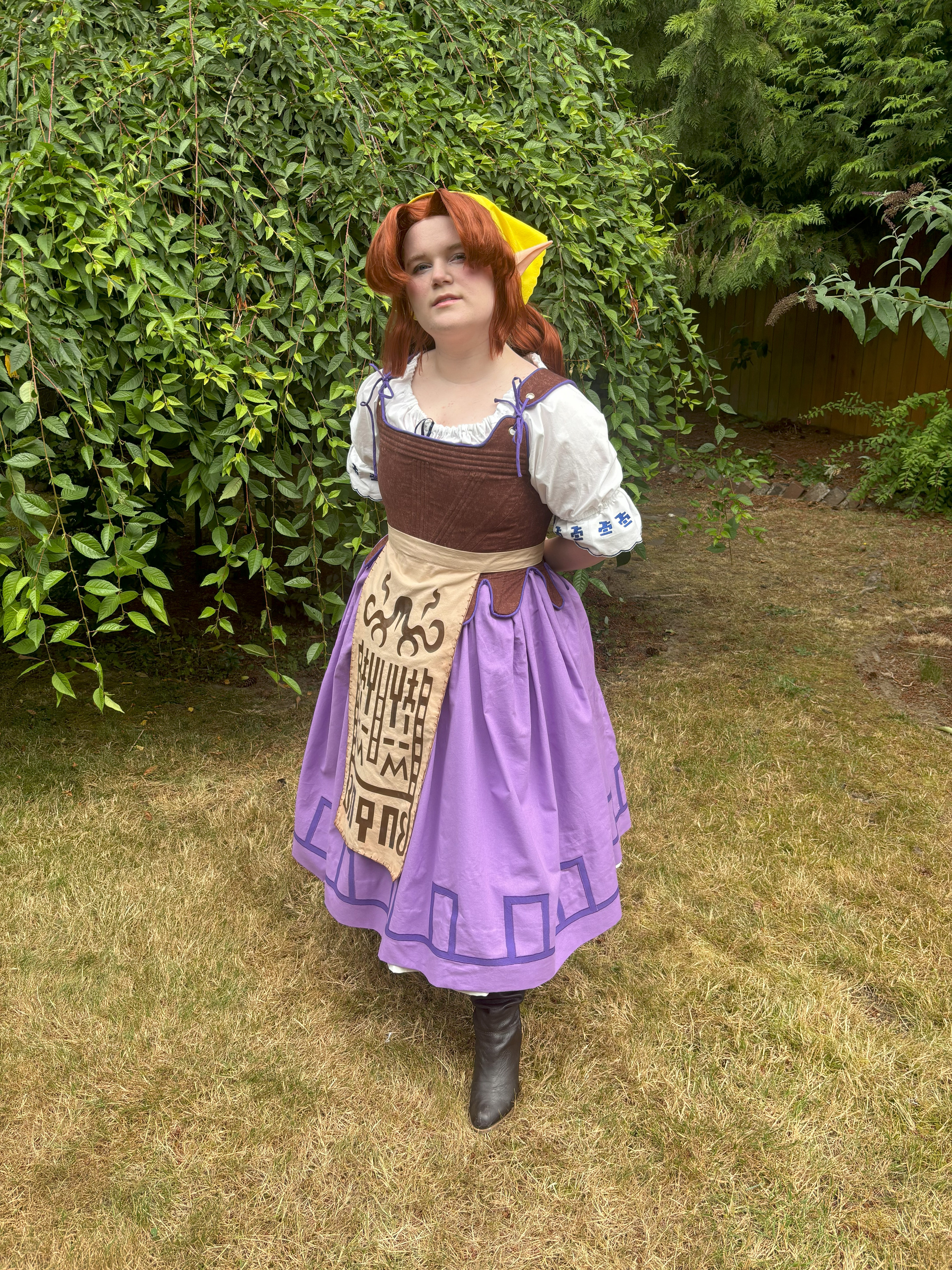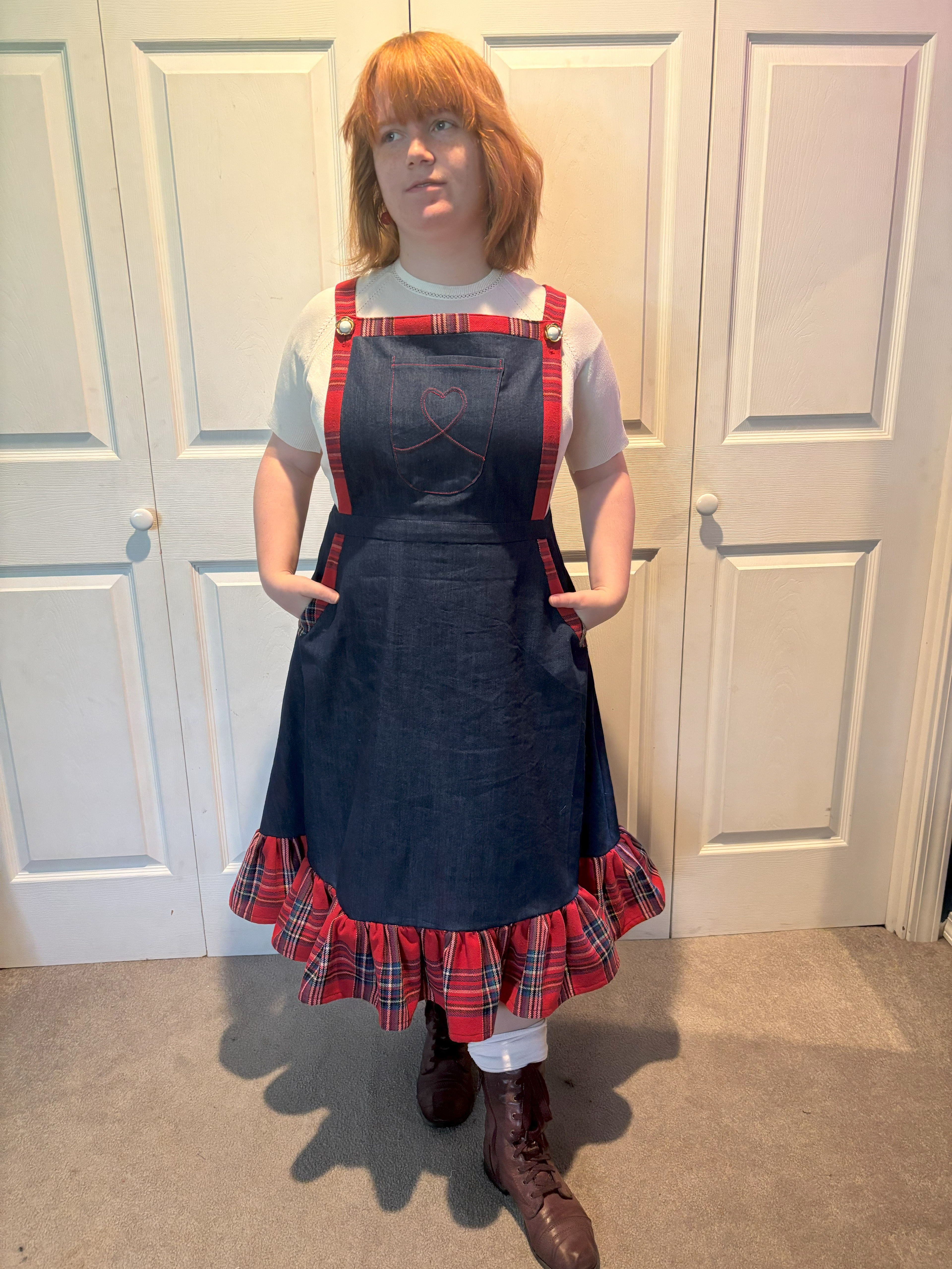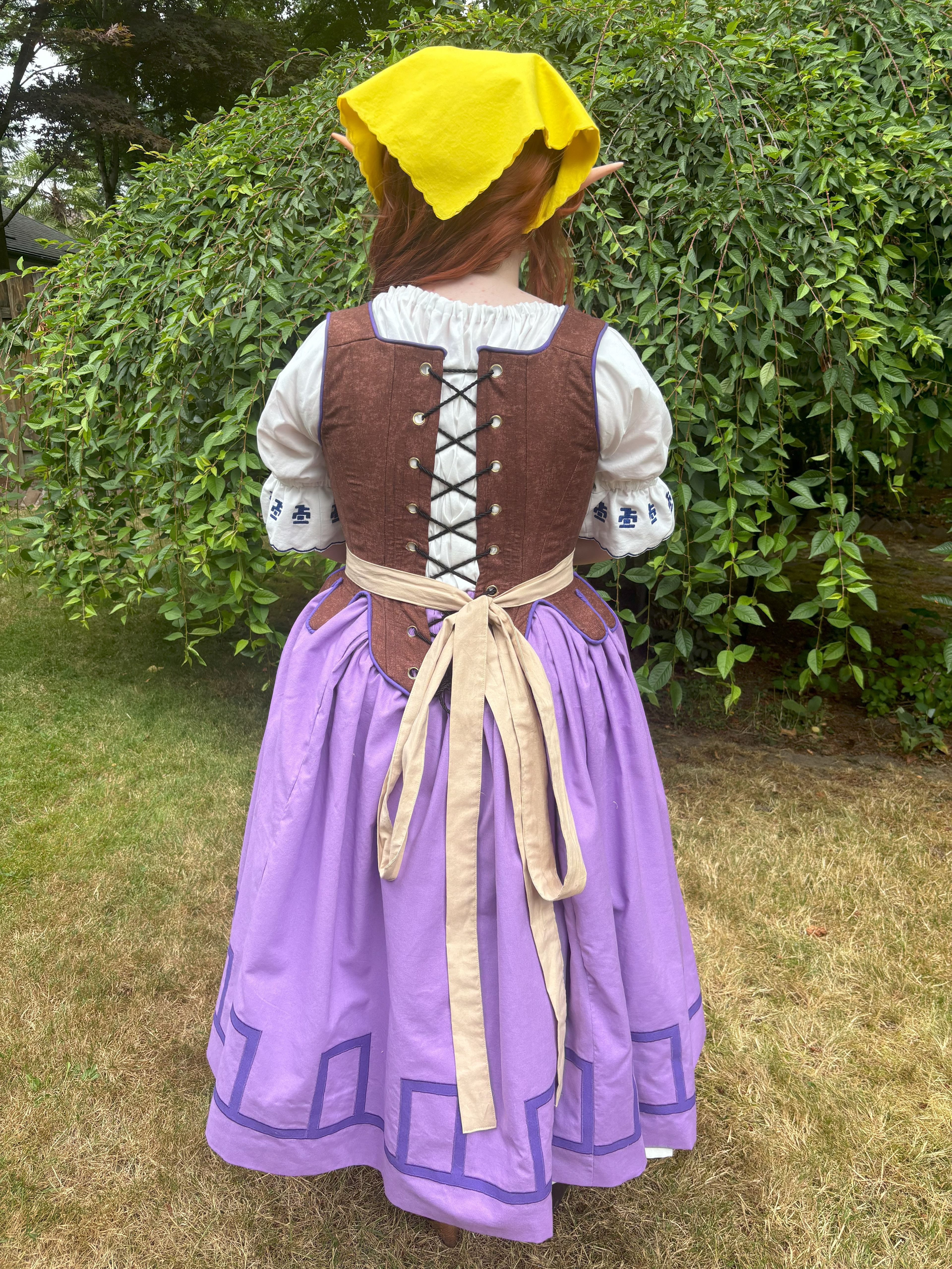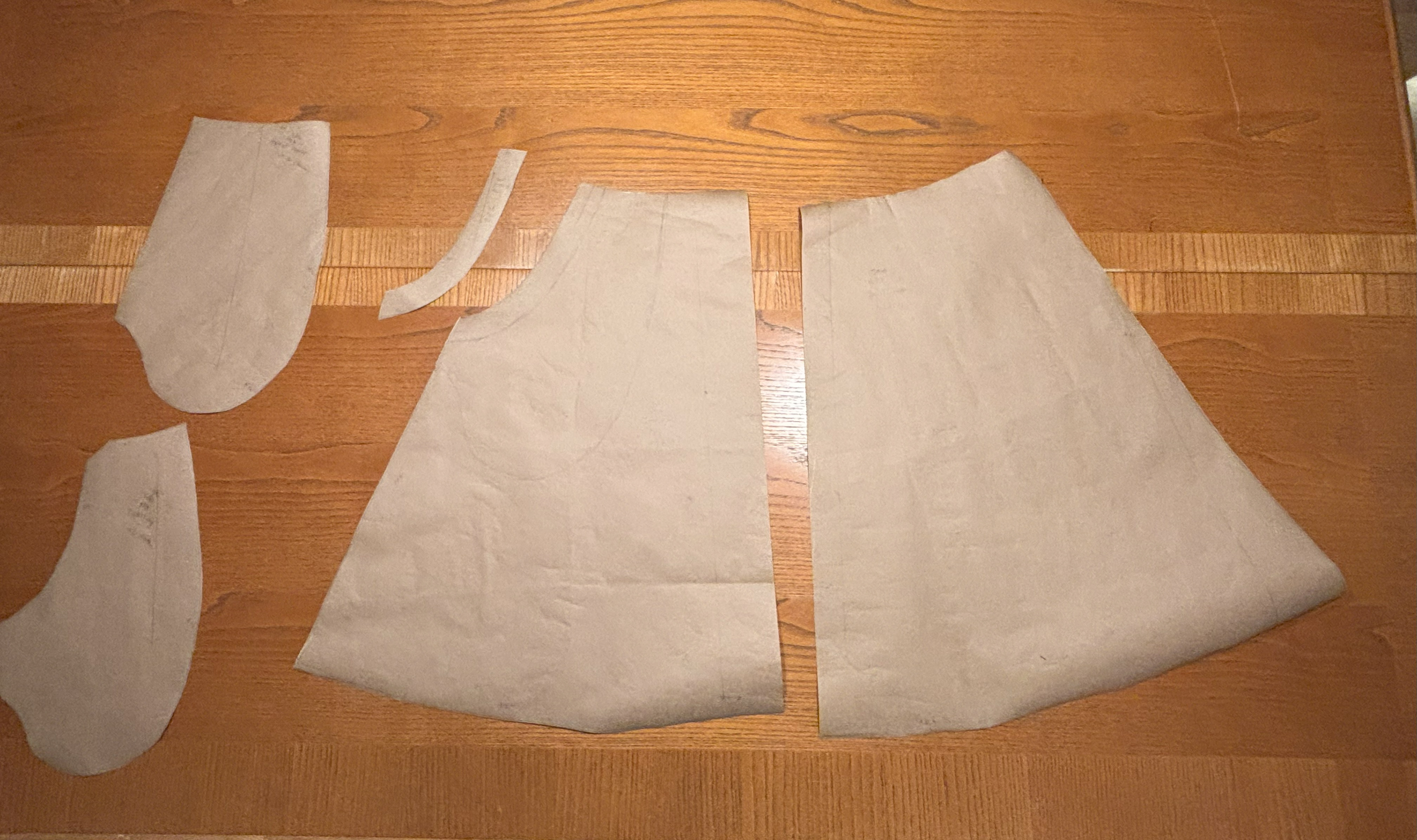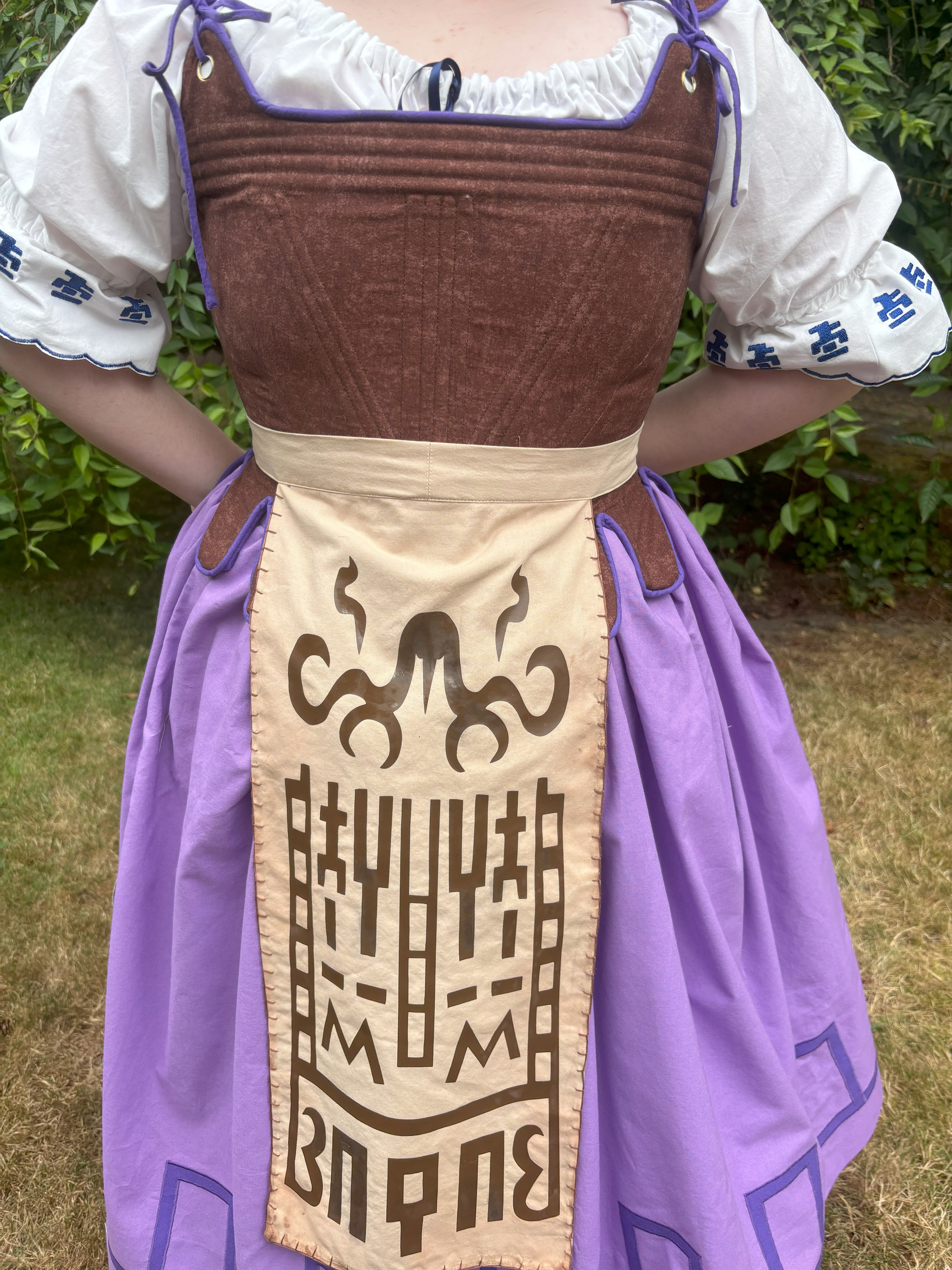 I made a body block of my corseted measurements and converted it into a stay pattern by referencing pictures of the garments and pictures of pattern pieces. The chemise was sewn out of fashion fabric to start with, as well as the petticoat. The tucks were thread-traced and then stitched. For the design of the skirt, I used Heat and Bond light on cotton and satin, stitched around the edges. I used a Cricut to design and cut out the shapes to keep them more consistent. For the apron, I used iron-on vinyl and drew and cut it out with the Cricut. I used a program called Inkstitch to make an embroidery file and did a test on scrap fabric. When it went well, I moved to the final and added them to the sleeves.