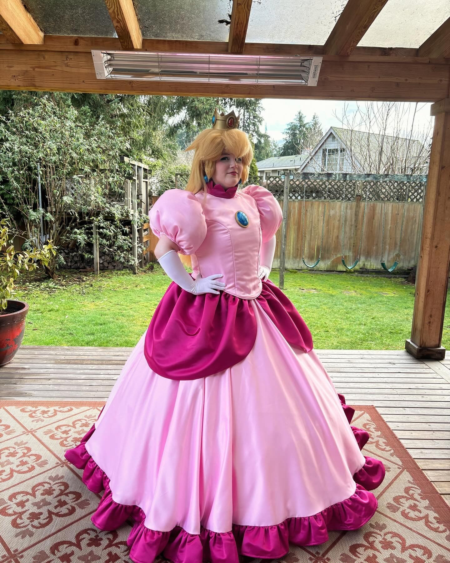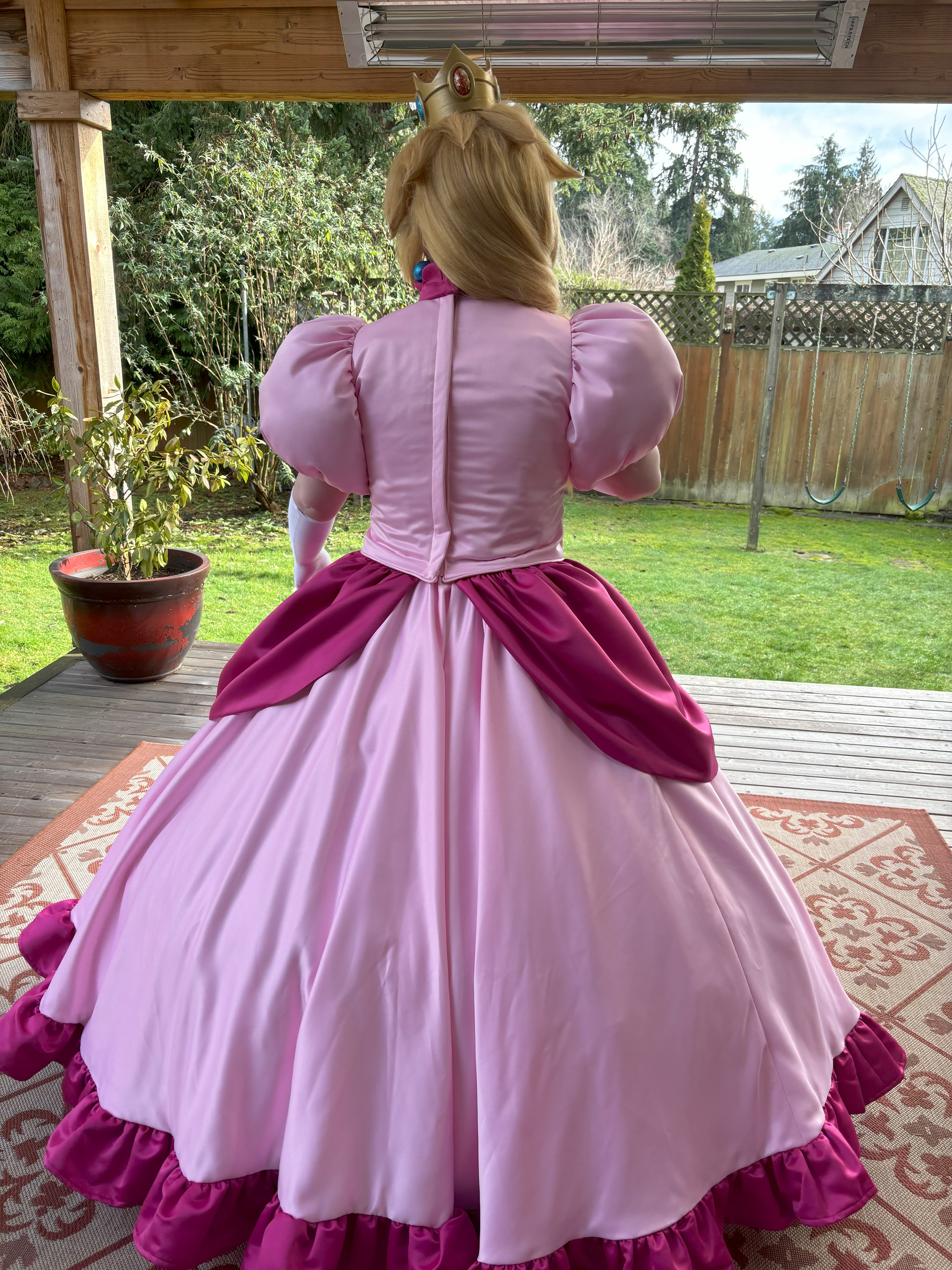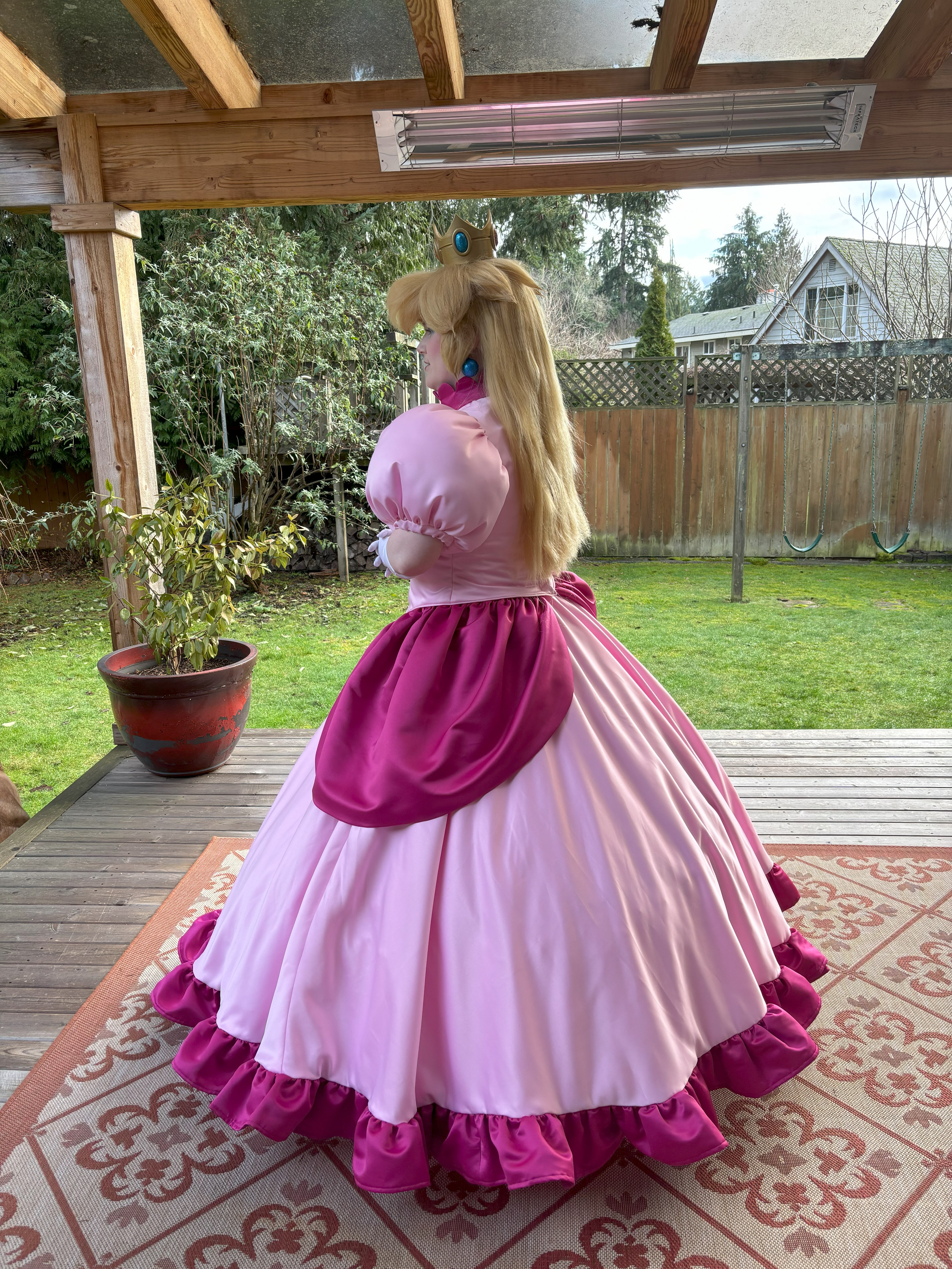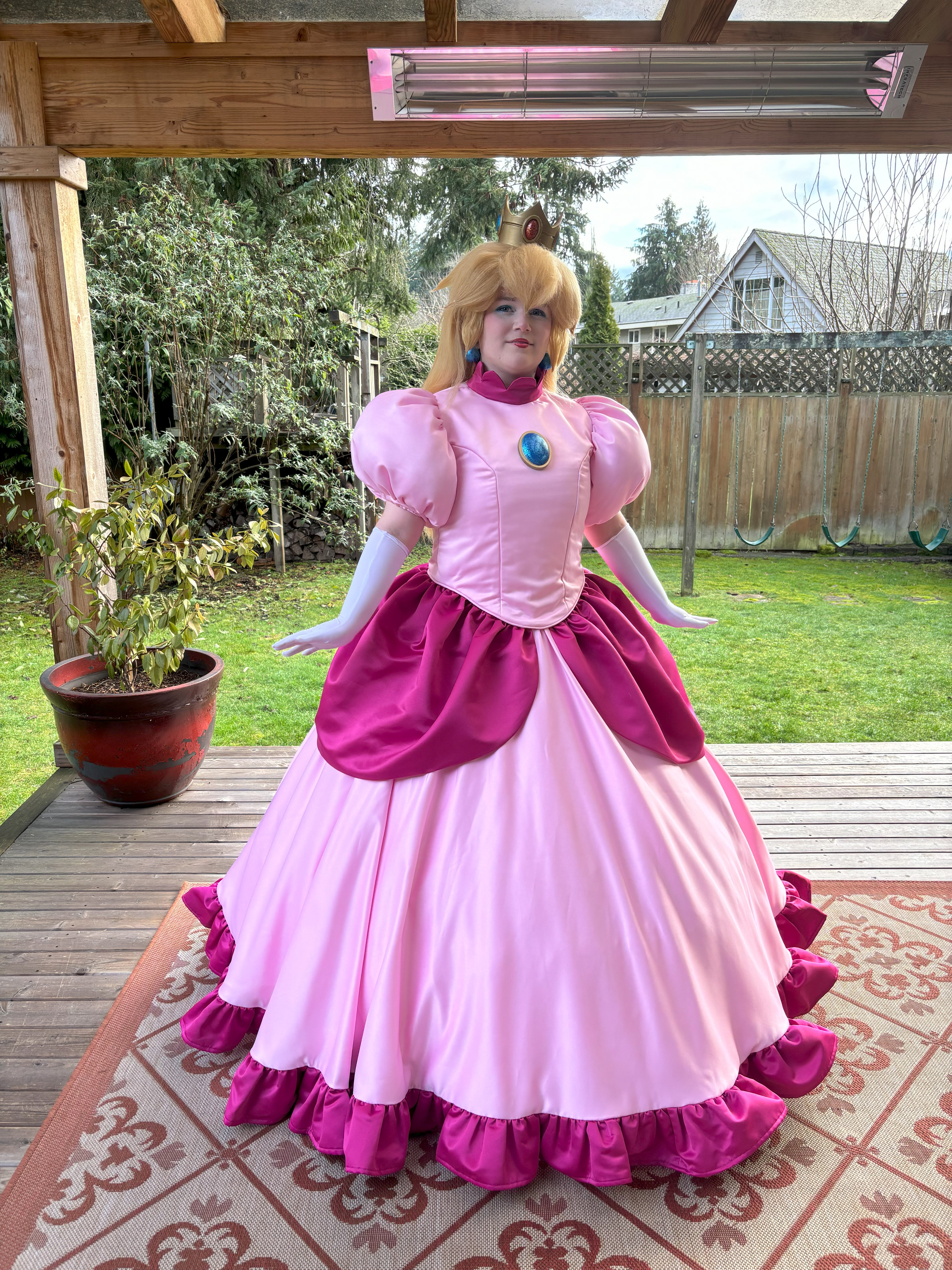 The bodice was patterned as a body block first and then converted into a princess seam front. Each piece of the bodice has three layers: matte satin as the front, flannel cut on the bias, and then coutil with plastic boning. For the skirt, I used a ruffle foot to gather it. The sleeves have a normal fitted short sleeve under the gathered sleeve, and then polyfill is put in to achieve a full look.