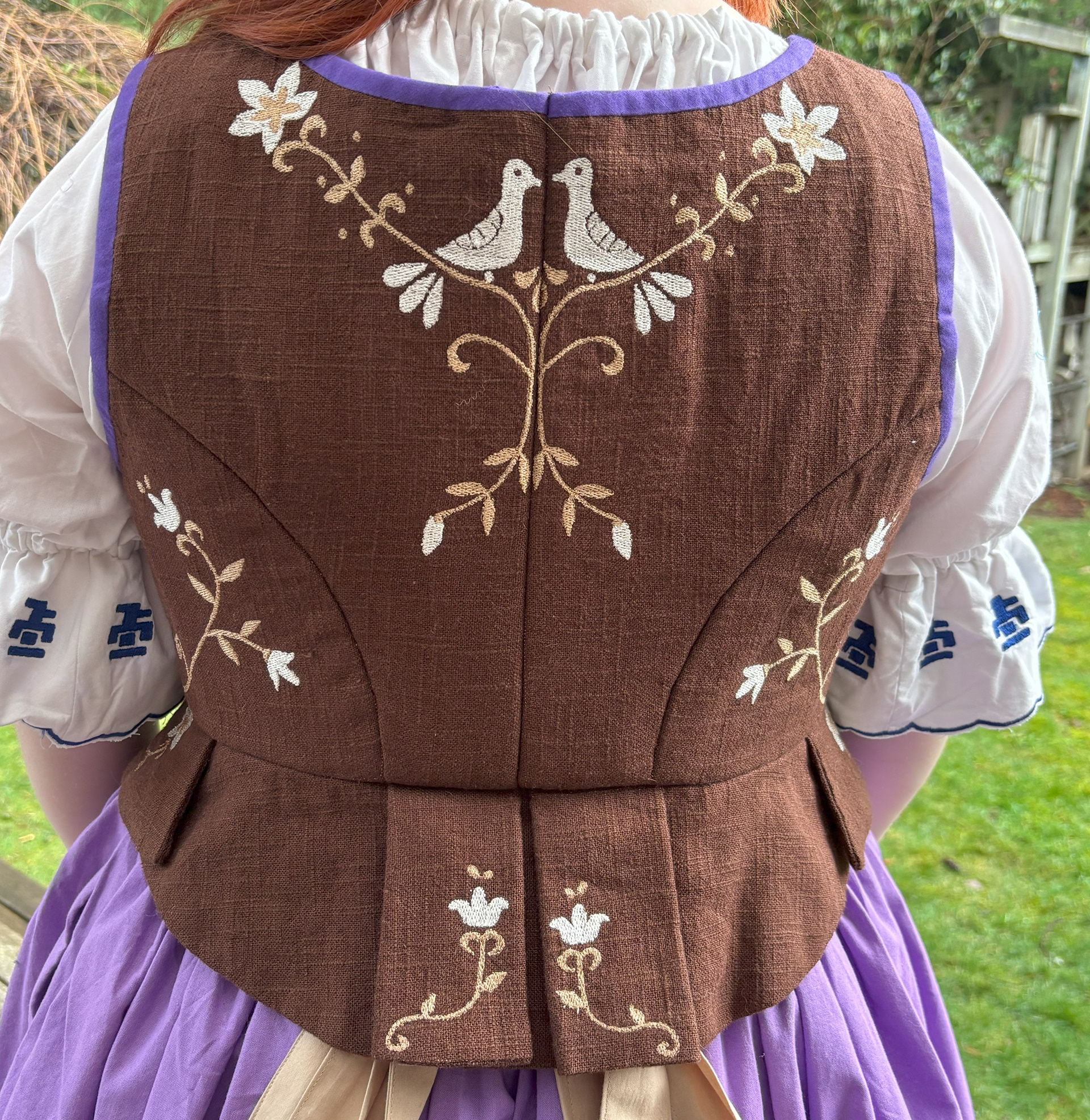 A classmate, Francesca Schnalke, patterned this project. I took the patterns, scanned them, and designed/ created embroidery files to go on pieces of the bodice. I cut out coutil and flannel layers, put the boning channels in the coutil, and embroidered the fashion fabric. Then, it was all flatlined on a curve and sewn together. The tabs and peplum are bagged out, bias tape is sewn to the raw edges, and then the peplum and tabs are attached.