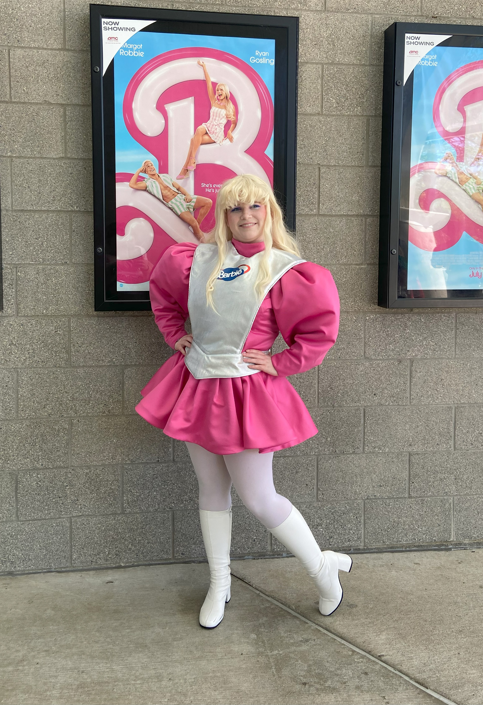 The skirt is 3 circle skirts, two out of cotton and one double my waist measurement in matte satin. On one of the cotton circle skirts, I gathered strips of folded-over 6-inch strips of tulle in rows two inches apart. After that, I did four layers of gathered tulle from the top the length of the skirt to smooth it out and add more volume. Then I sandwiched the cotton layer with tulle between the matte satin layer and the other cotton layer, and then put the waistband on. The tail was made out of PVC pipe, bent into a shape, and then put on a backplate with holes for a belt to slip through. Then I sewed a layer of fur fabric to cover it.