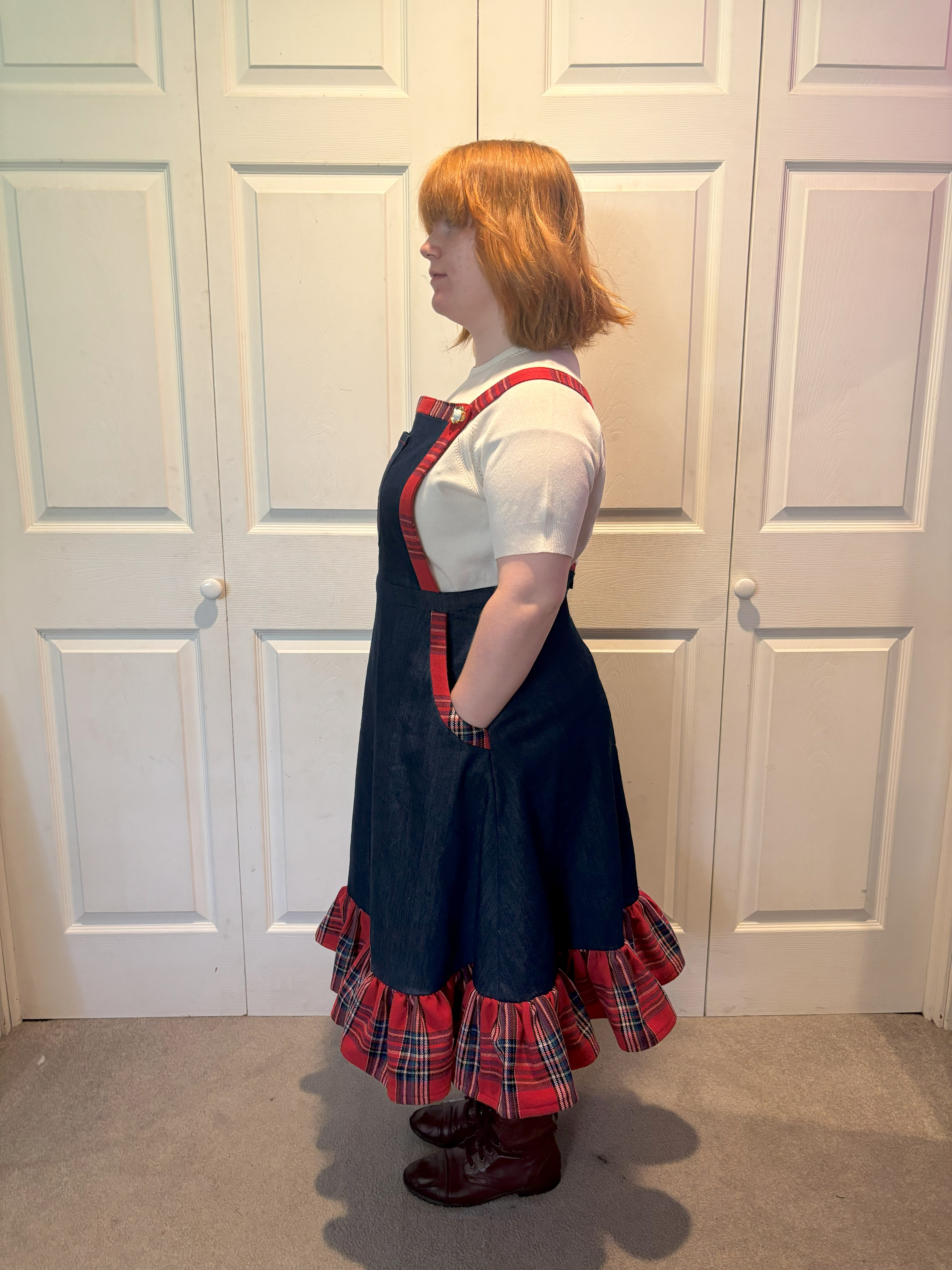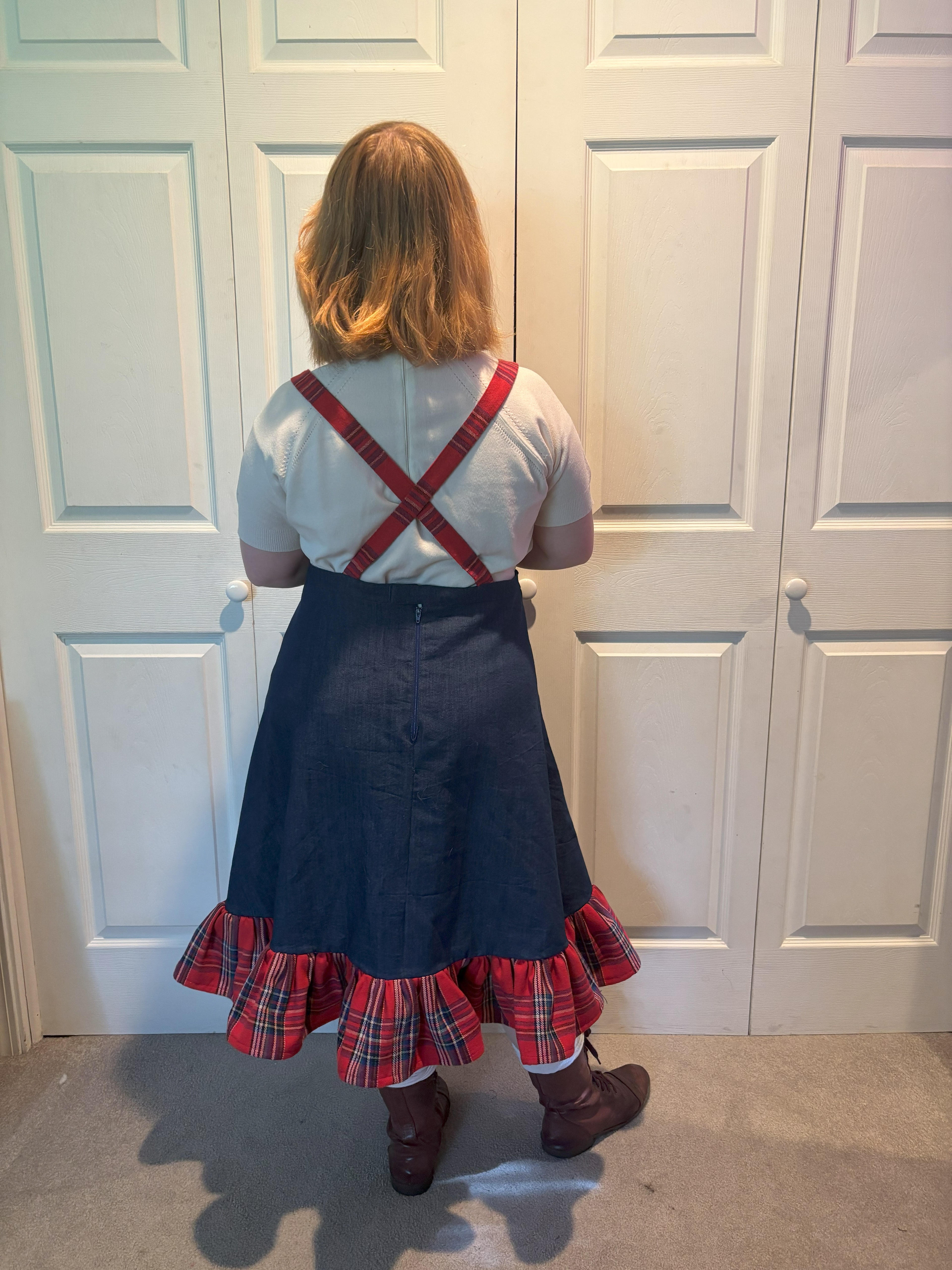 I was inspired by the band The Bay City Rollers to create a skirt version of the typical pants they wore for their performances. I was able to pattern it quickly; the real difficulty was making sure things were pattern matched when so little of the pattern is showing.
