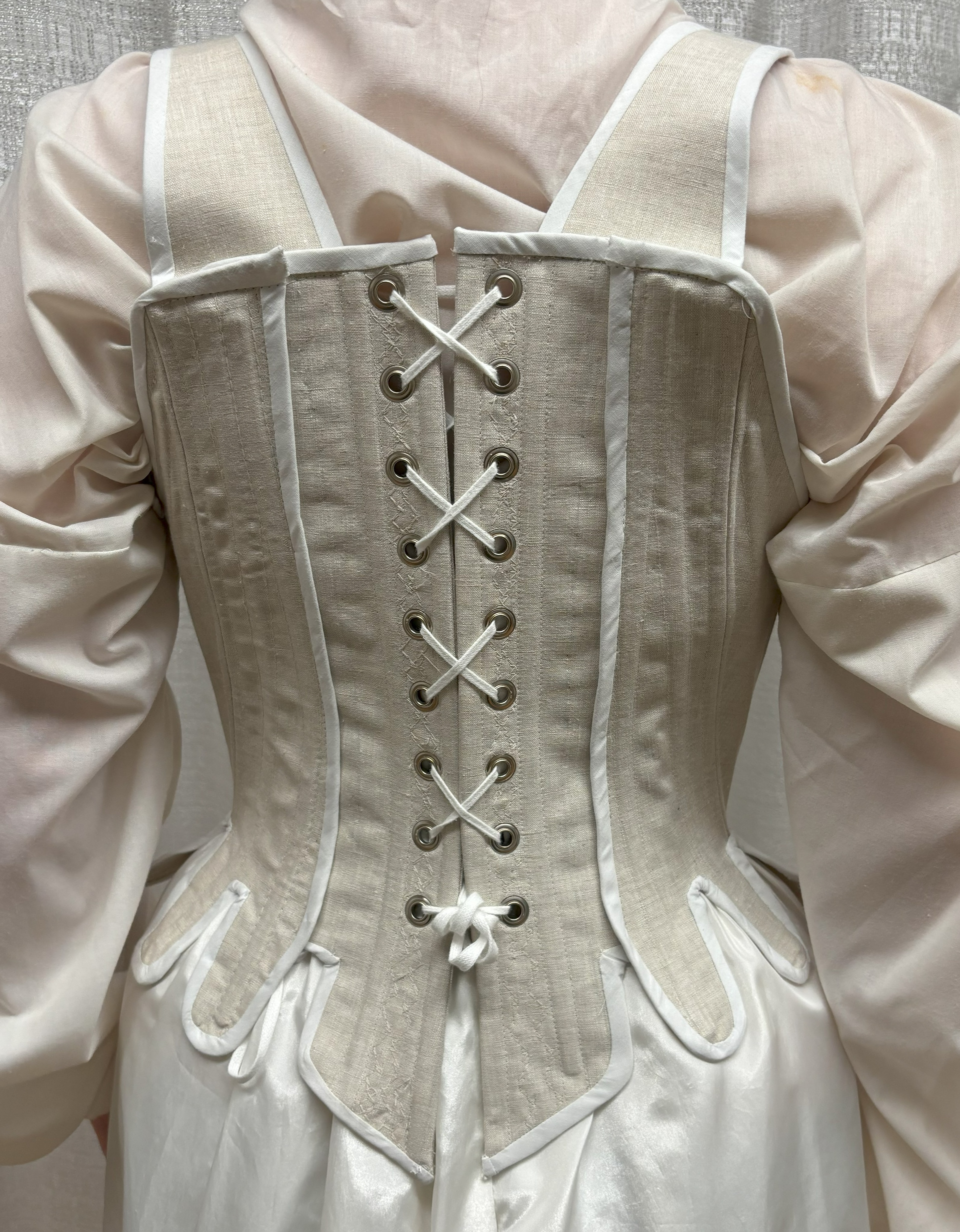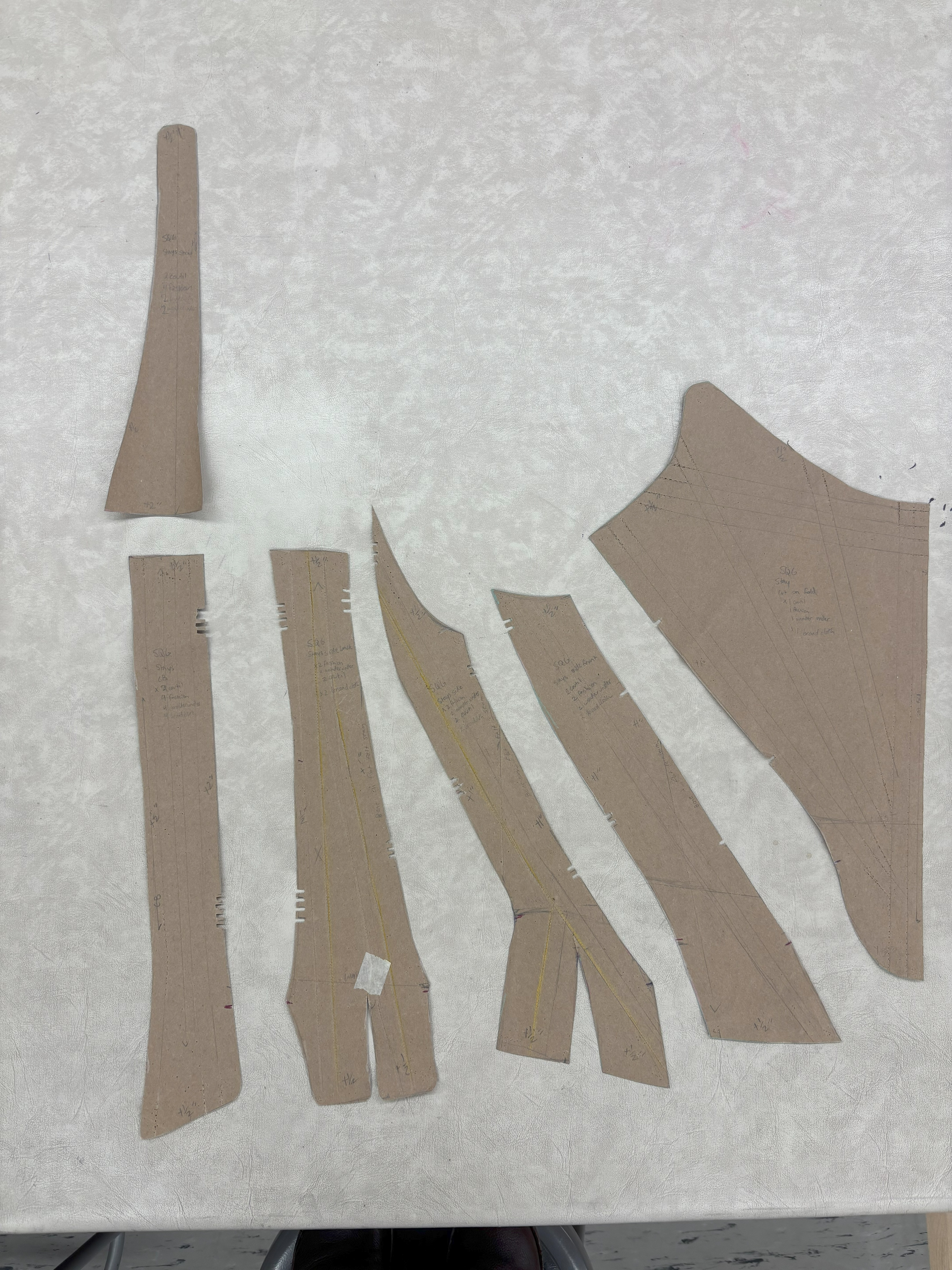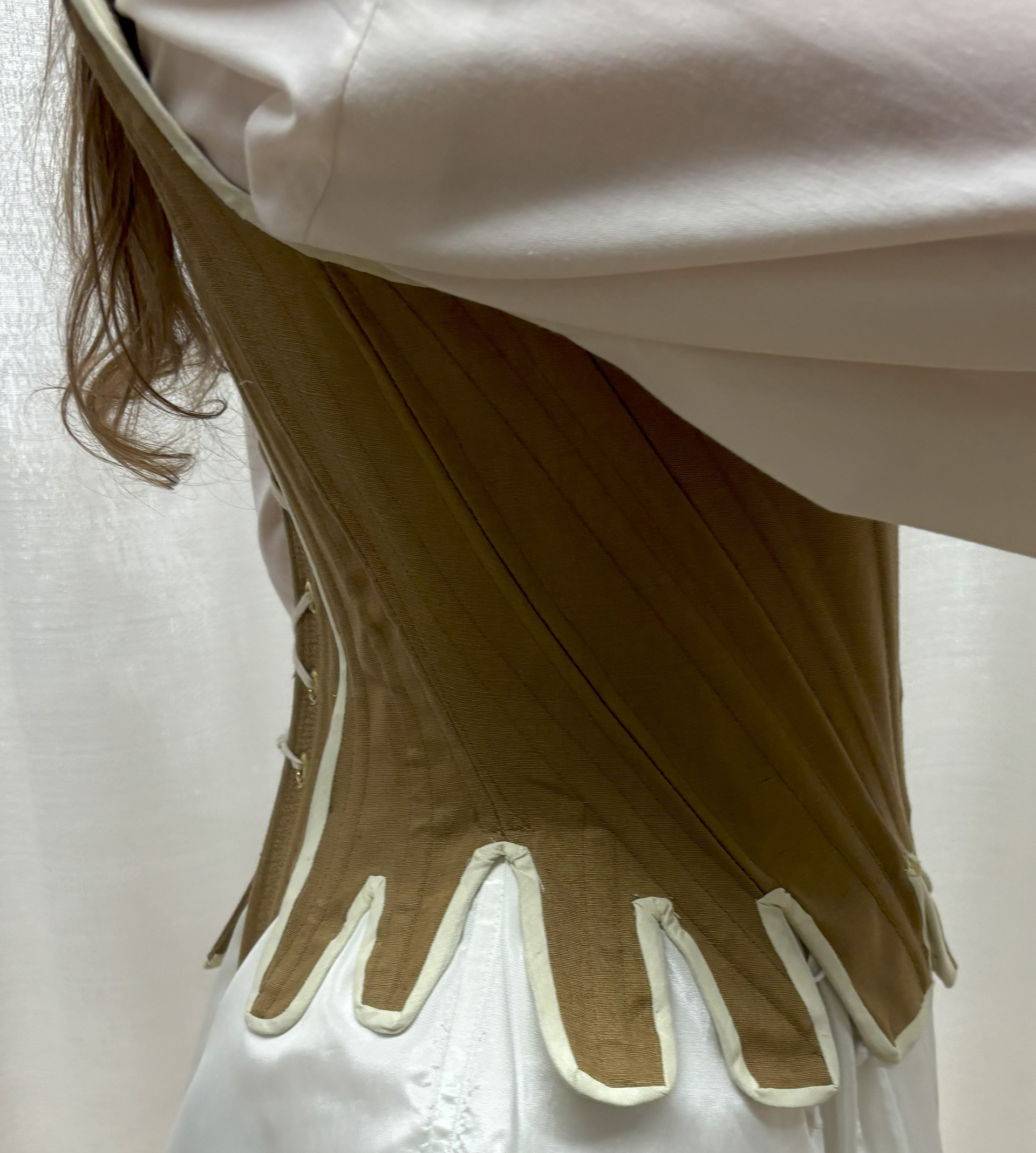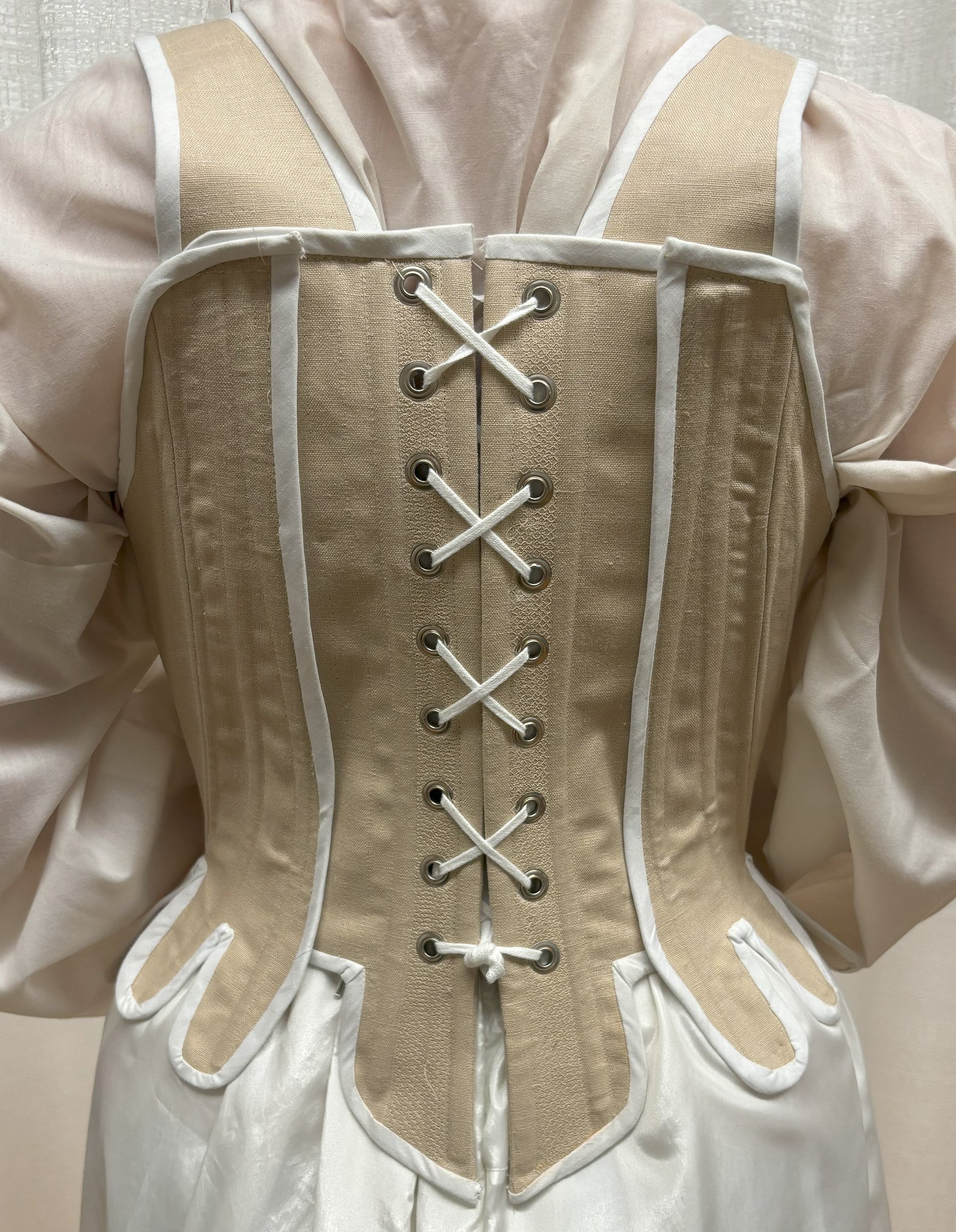 I patterned the corset using a draft from the book “Stays and Corsets Historical Patterns Translated for the Modern Body Volume 2”. After the pattern was corrected through a fitting, everything was cut out. The fashion fabric was fused onto broadcloth with wonder under and flatlined to the coutil. Then the boning channels were sewn, the corset was put together, and all of the seams had bones besides the back panel, as that is the alteration point.
