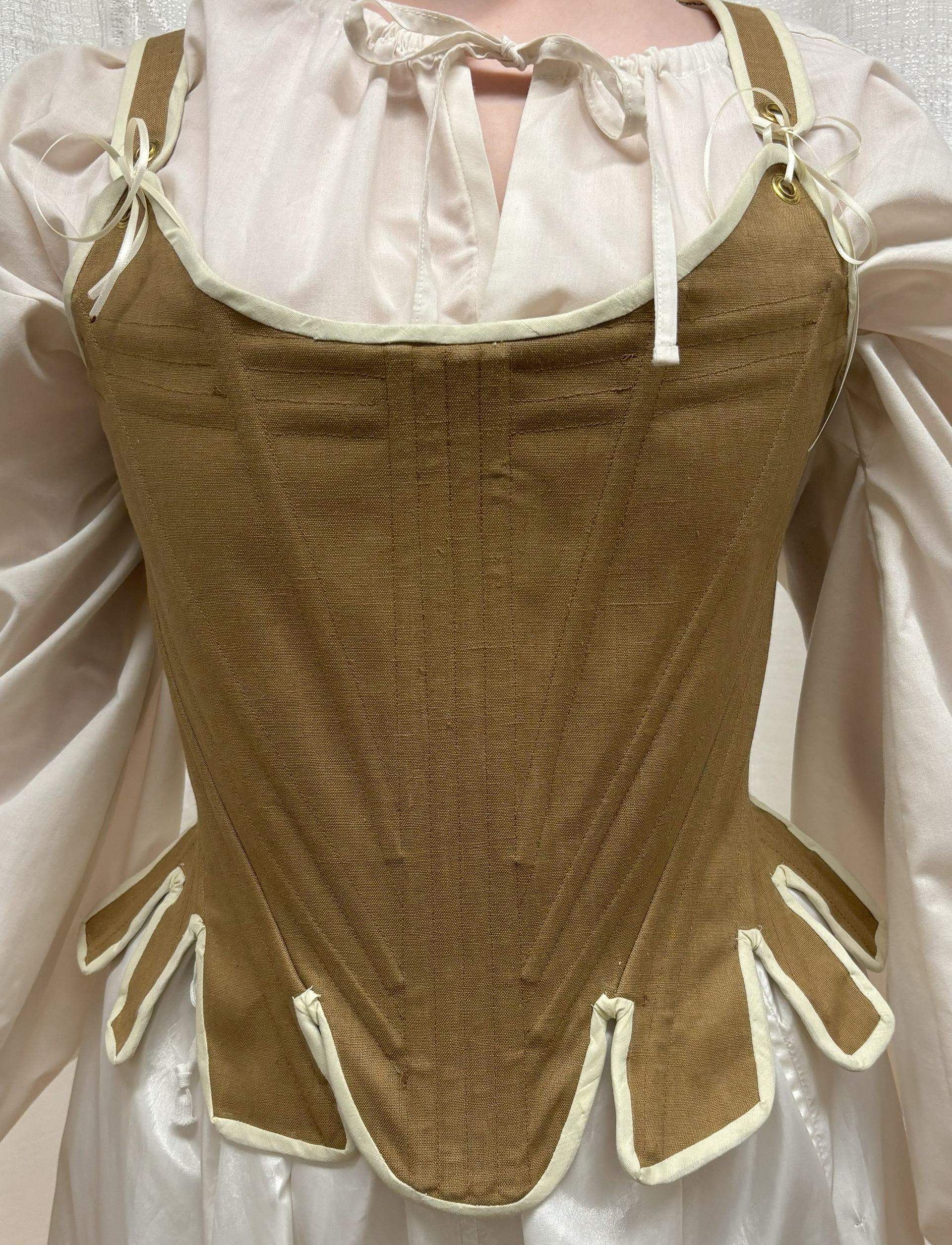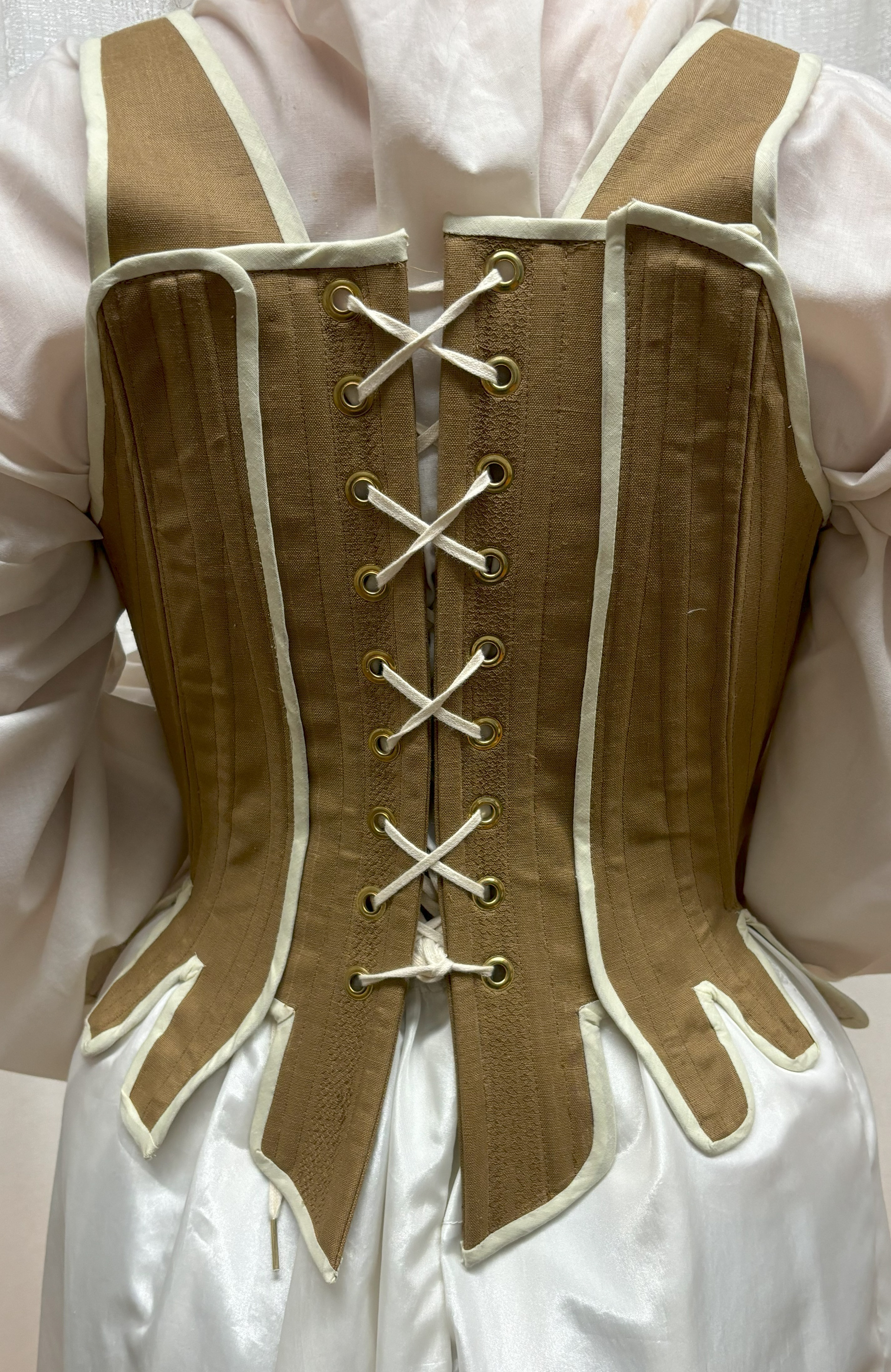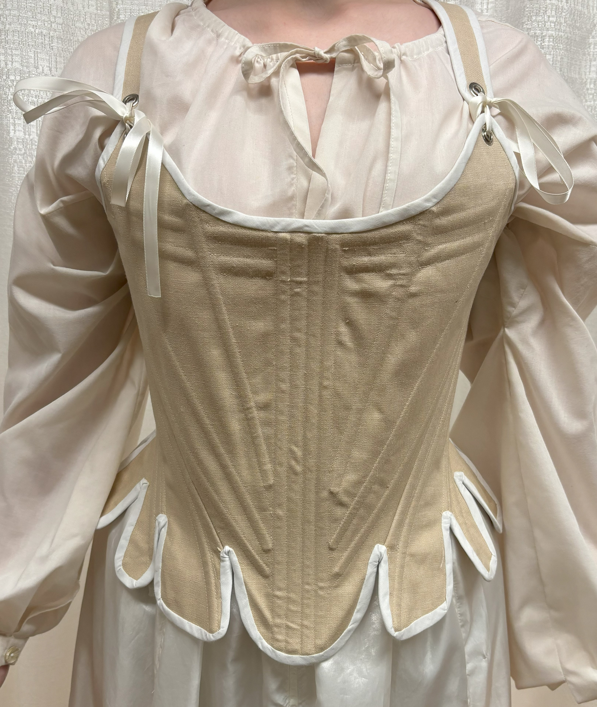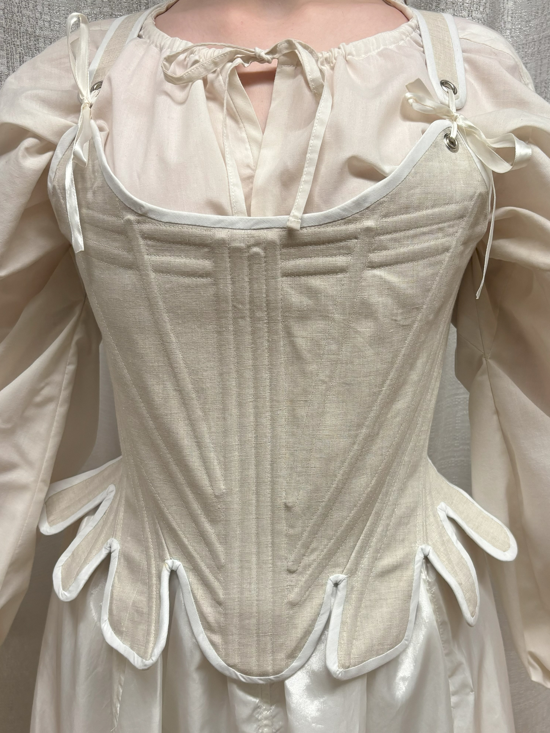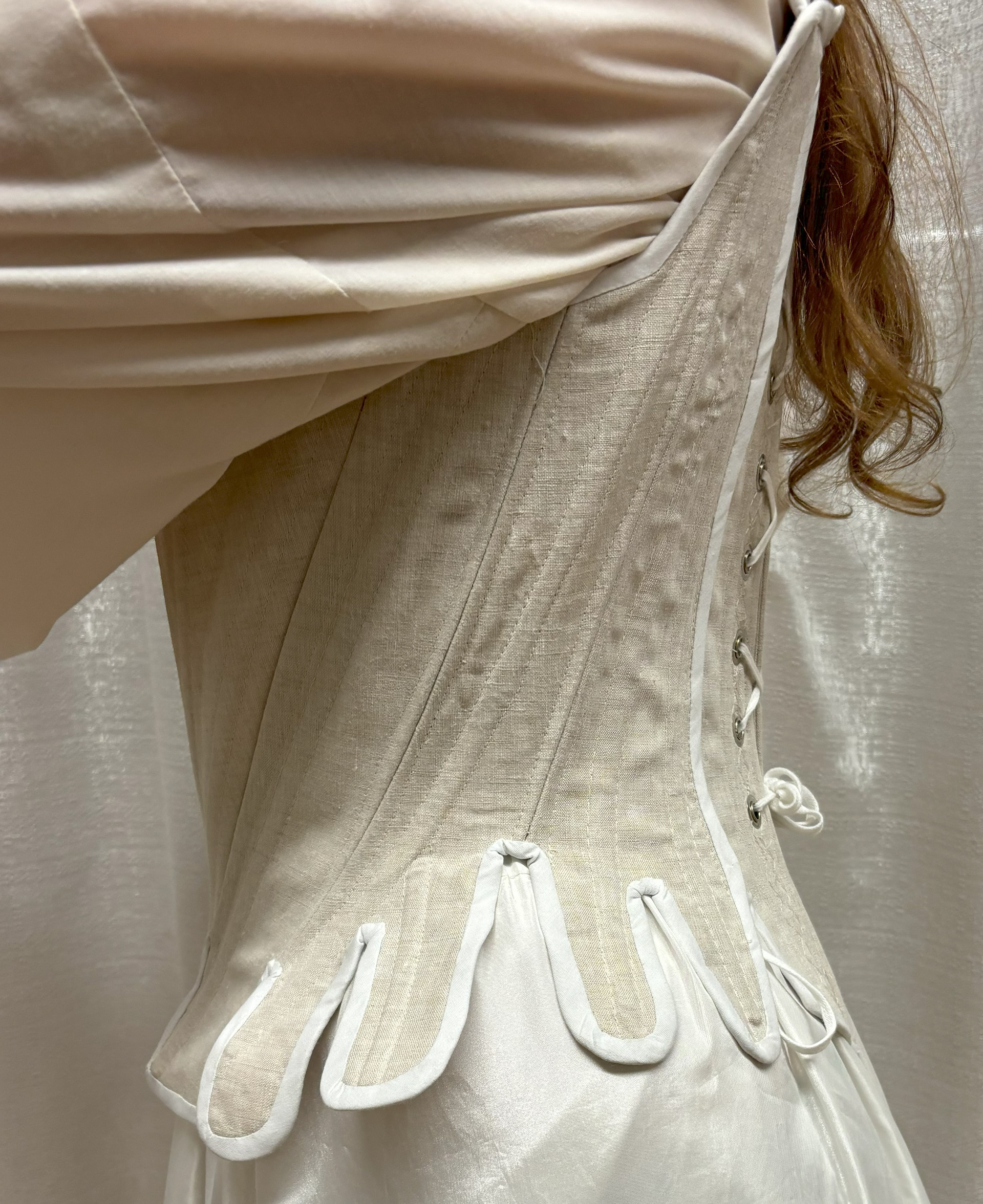 I patterned the corset using a draft from the book “Stays and Corsets Historical Patterns Translated for the Modern Body Volume 2”. After the pattern was corrected through a fitting, everything was cut out. The fashion fabric was fused onto broadcloth with wonder under and flatlined to the coutil. Then the boning channels were sewn, the corset was put together, and all of the seams had bones besides the back panel, as that is the alteration point.