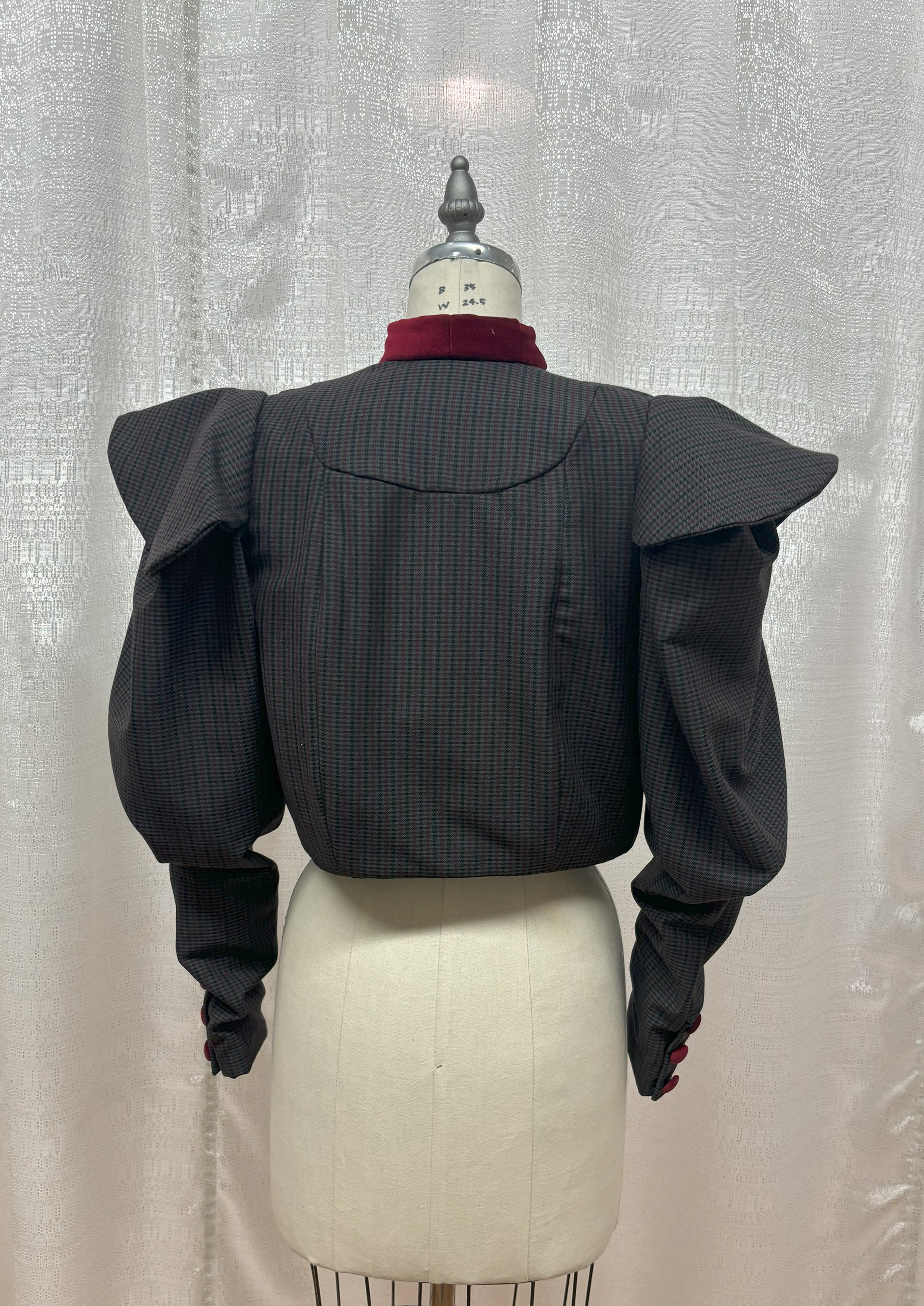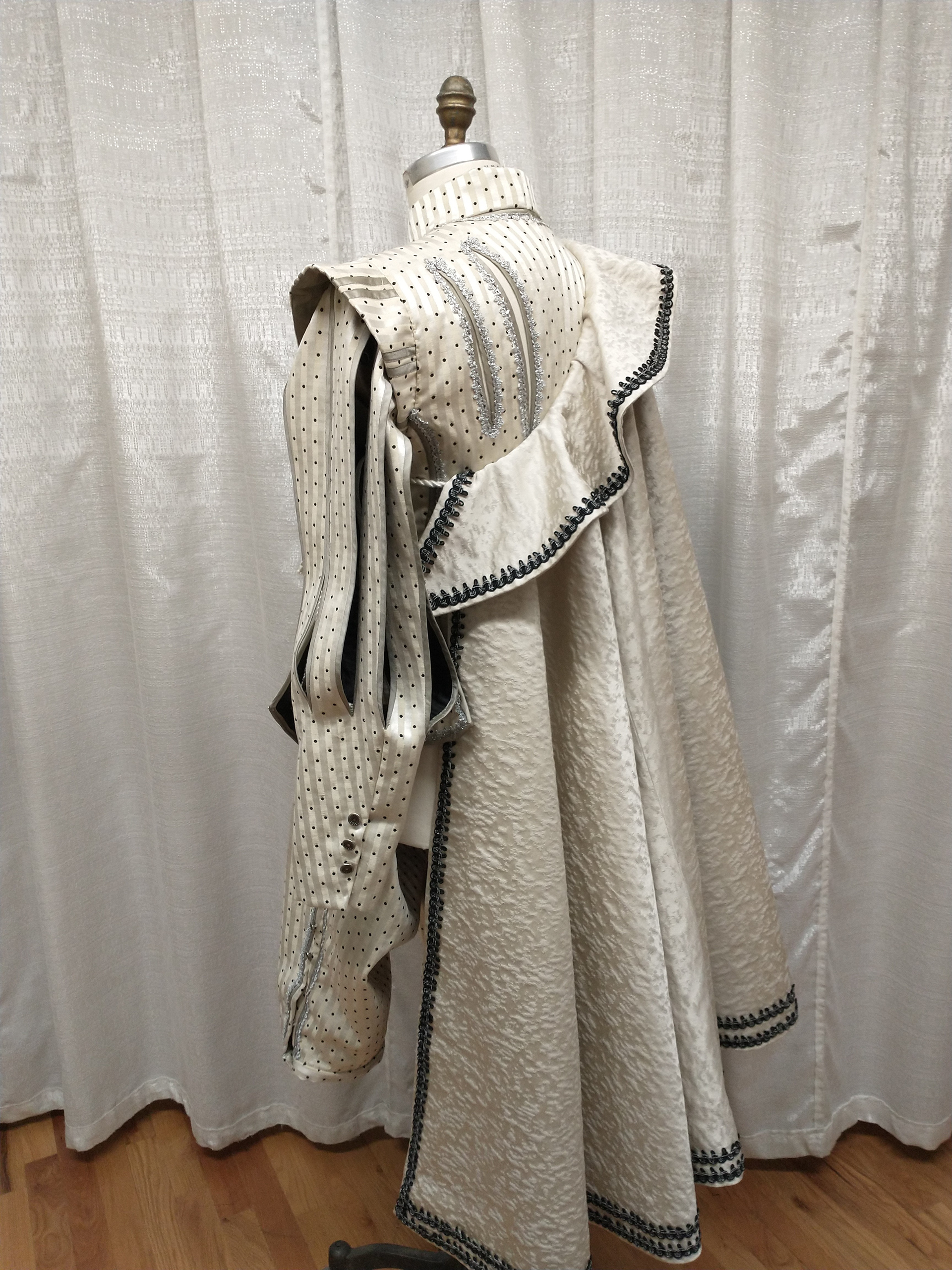 For this build, I worked with another draper, Iris Barger. She made a block for the singer. I adapted the corrected block to be this open overcoat. It is fully lined, and there is a seam at the waist to allow for a better-fitting garment. I made the belt from fabric with some collar canvas to give it structure. I also made trim for the sleeves out of the same fabrics as the belt.