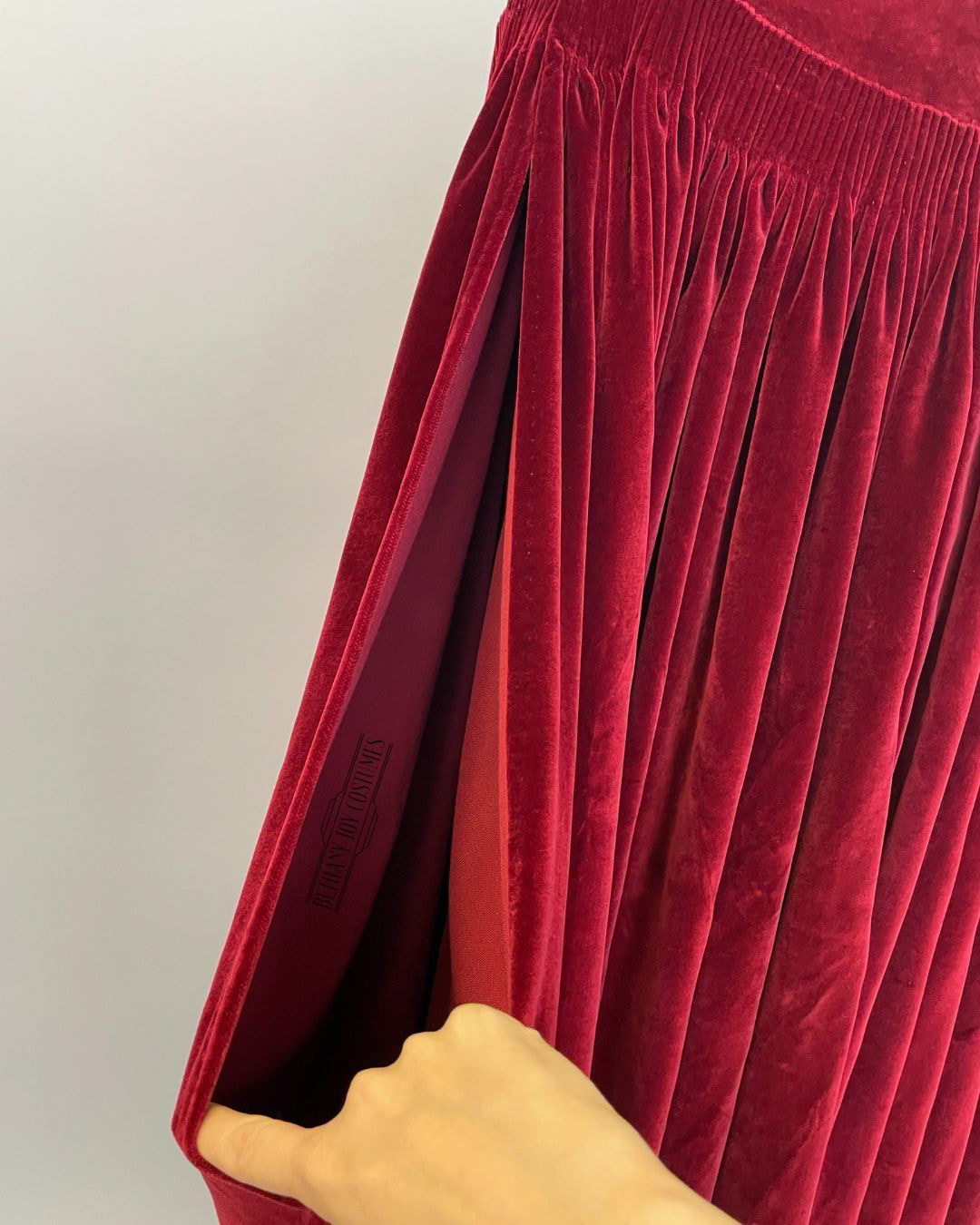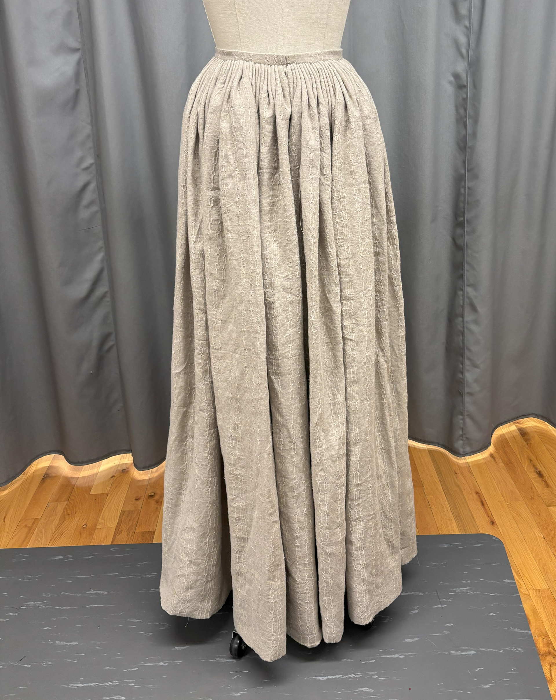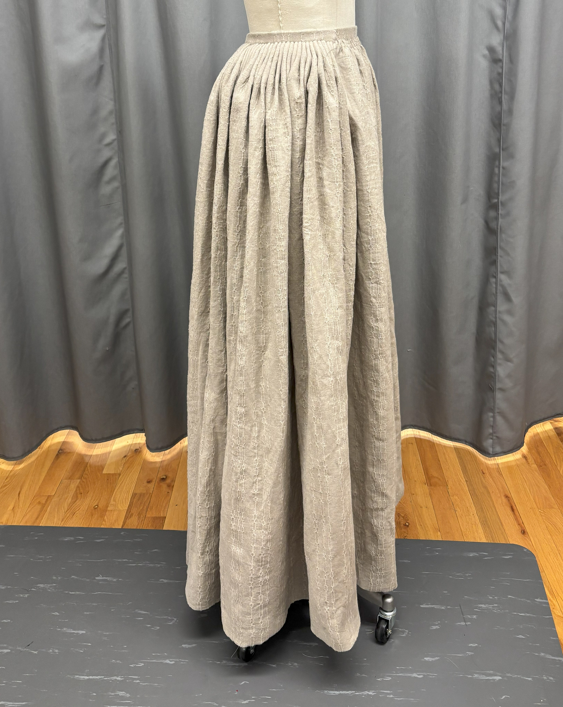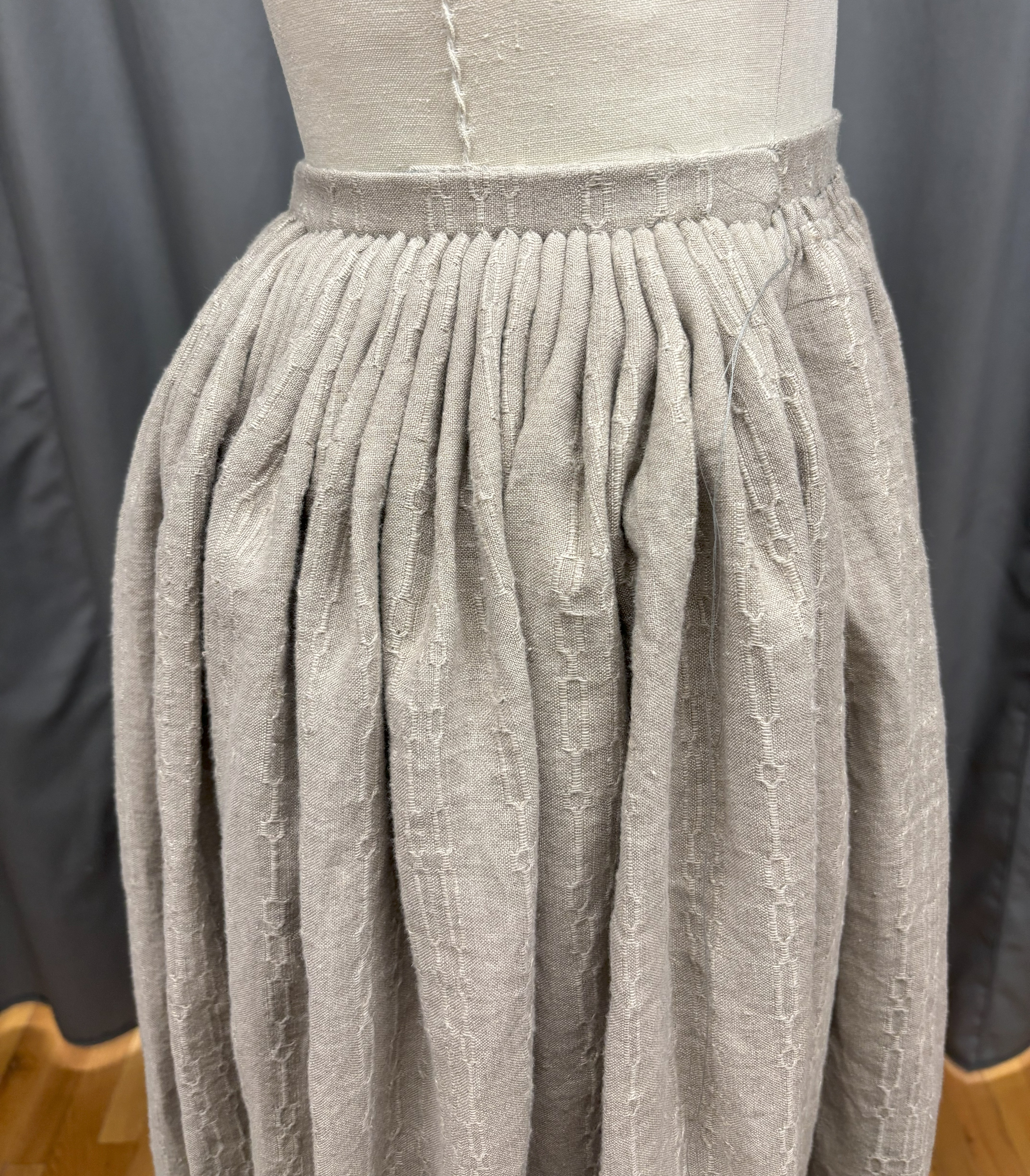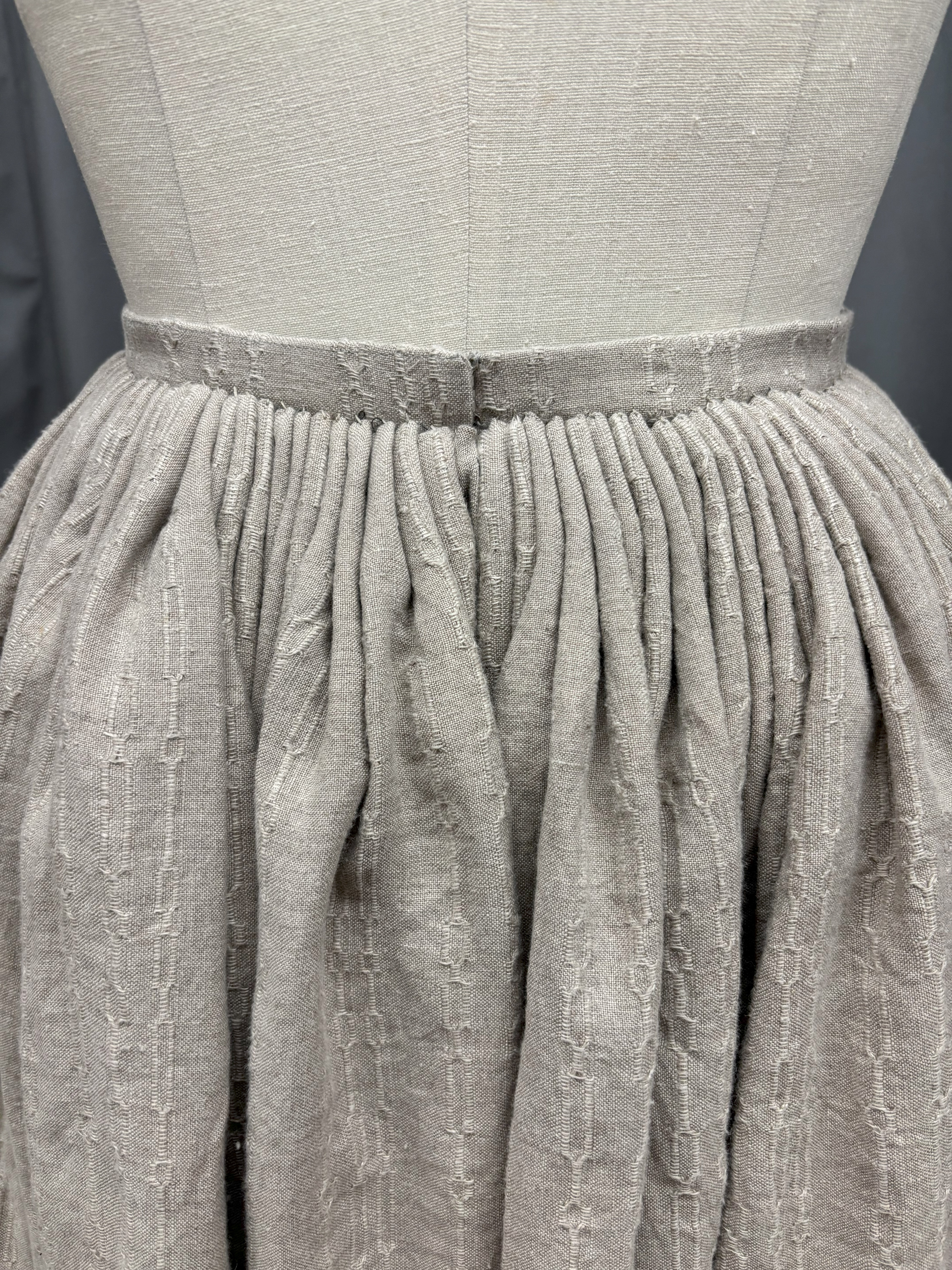 For this skirt, I was given a waist measurement and an outseam to make a cartridge-peated skirt. It’s made of a cross-grain continuous fabric cut, and the shaping is provided at the waist to account for the hips and possible bum roll. Flannel was put in the waist seam allowance to bulk up the pleats. The back seam was sewn, and the placket was put in. Then it was pleated and sewn to the waistband. On the front of the waistband, right before the skirt transitions to gather, the waistband is separated to allow for alterations if needed.