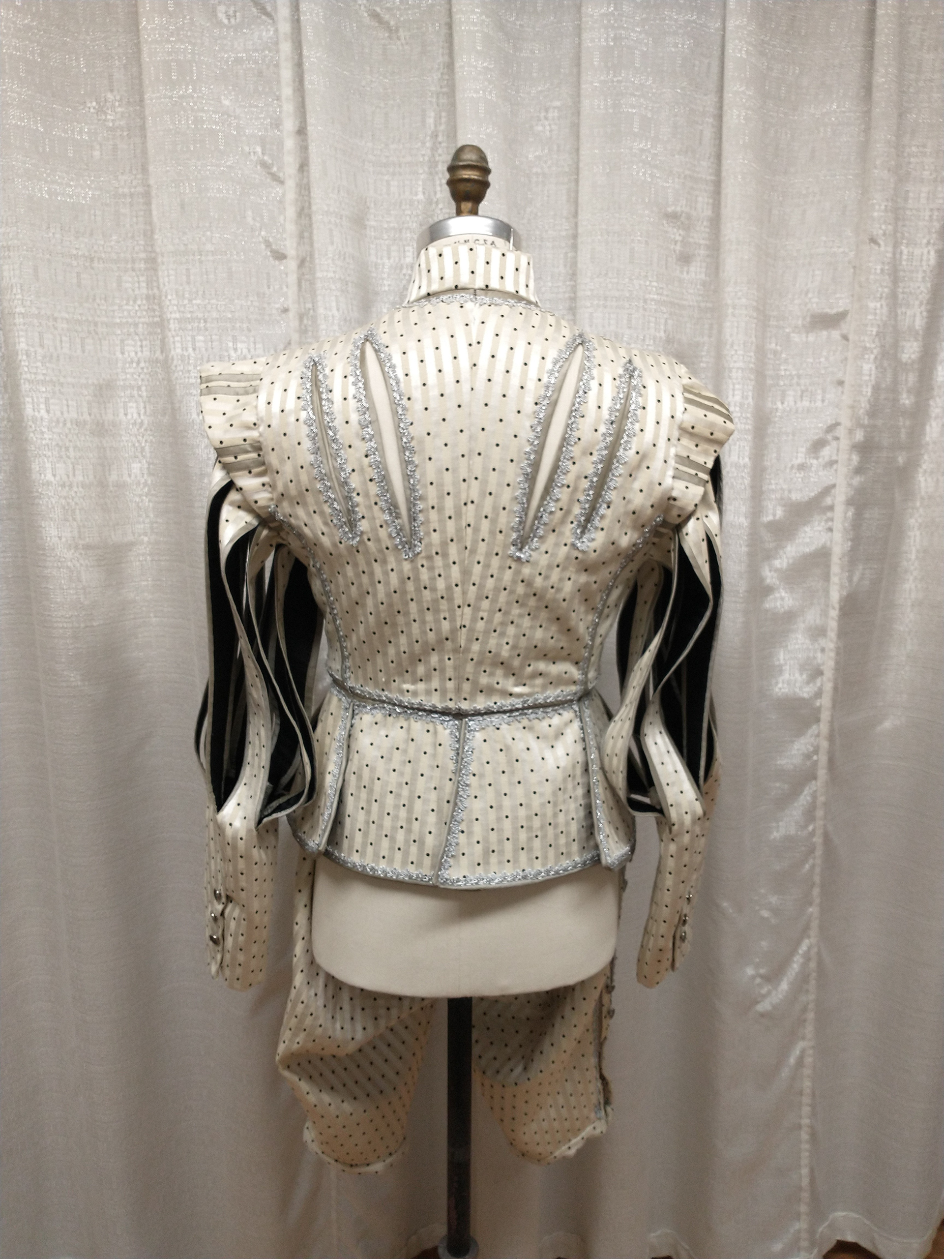 I cut out the mock-up and sewed it together. For the final, I flatlined the fabric, bag-lined it, sewed it together, and did the body slashes. I also did a lot of the closures. The slashes were made of bias-cut strips. A centerline was drawn, sewn a quarter of an inch away from it, and tapered at the ends. It was then cut in the middle and folded to make a bias tape-like appearance.