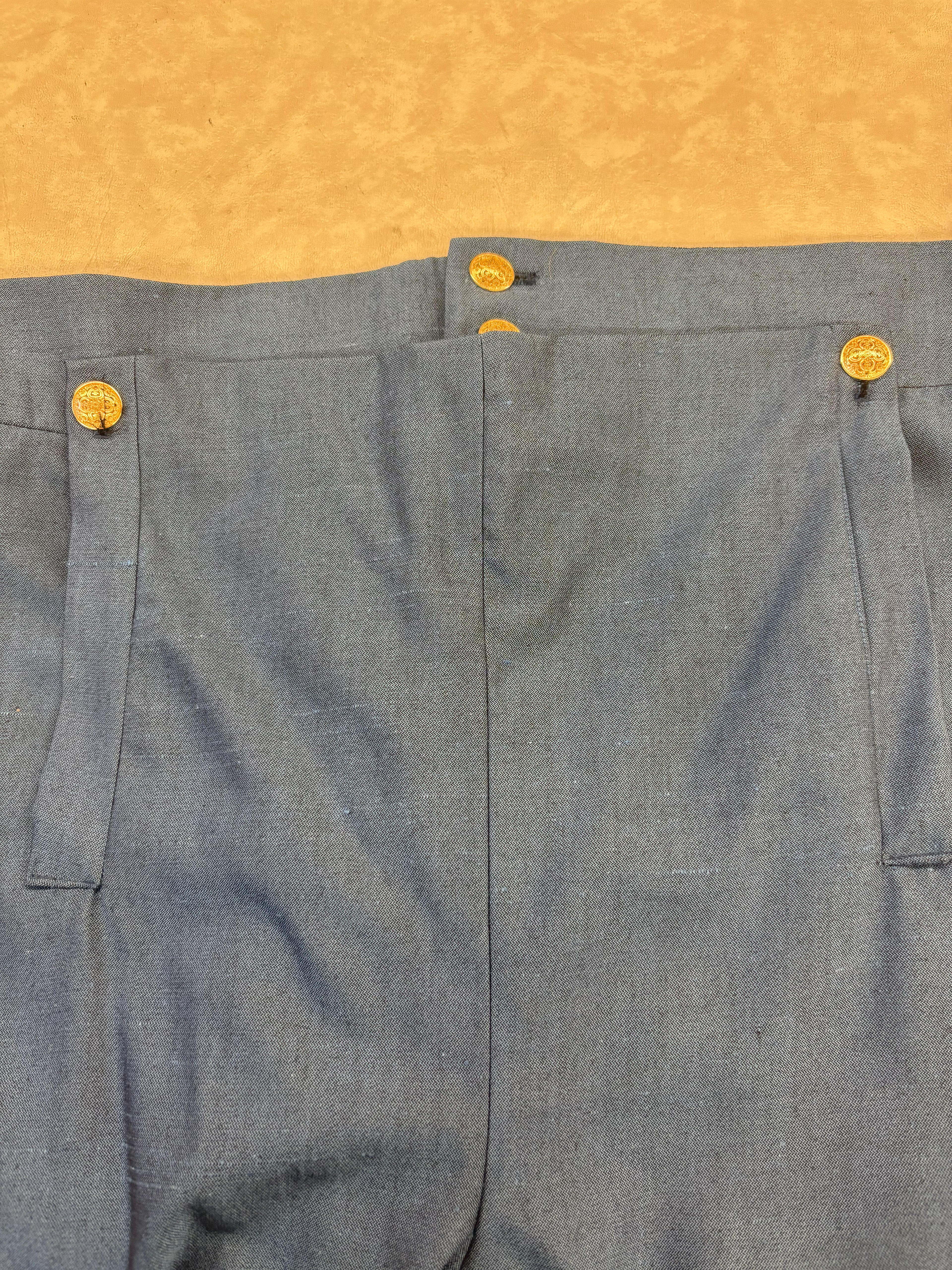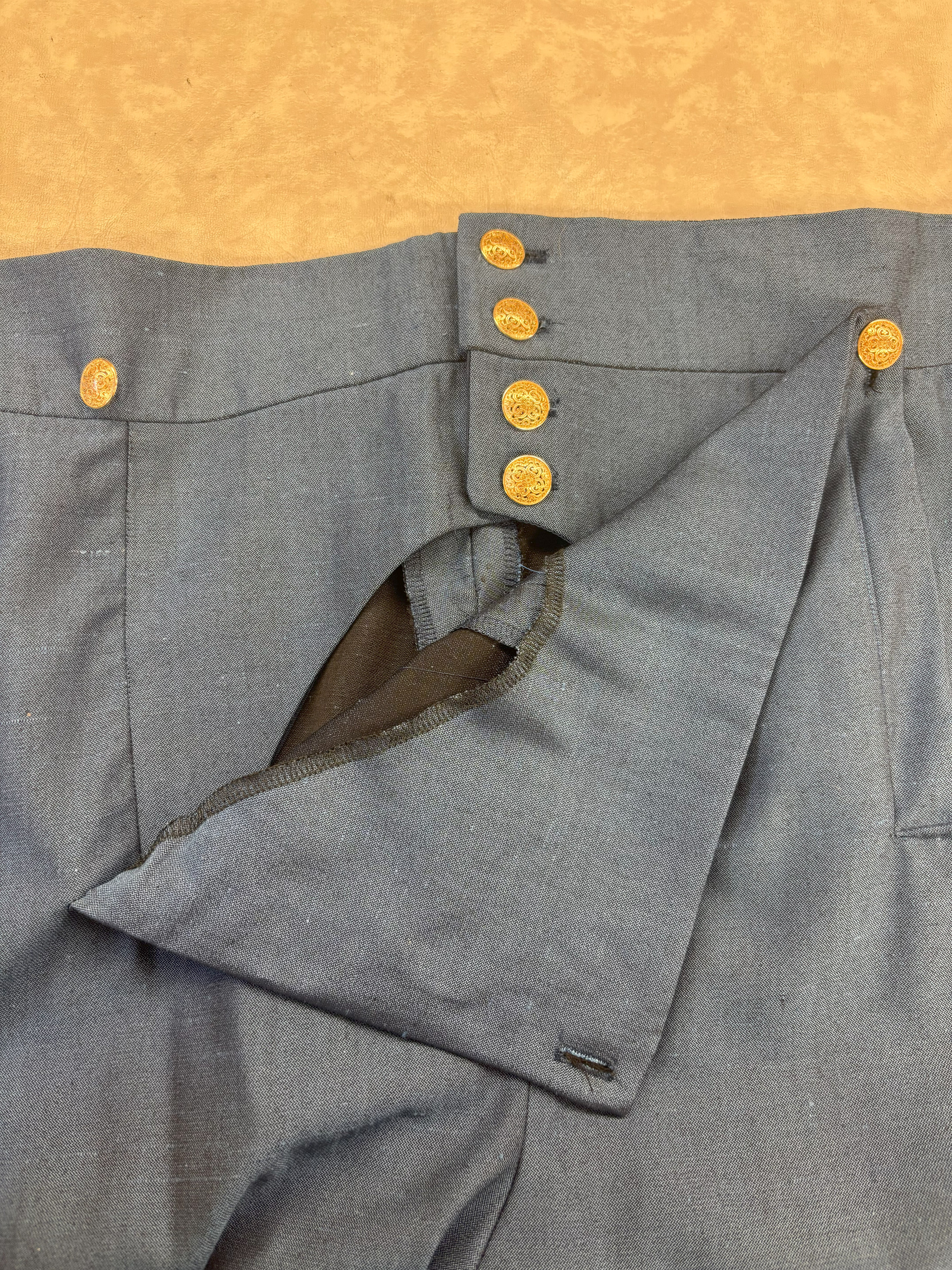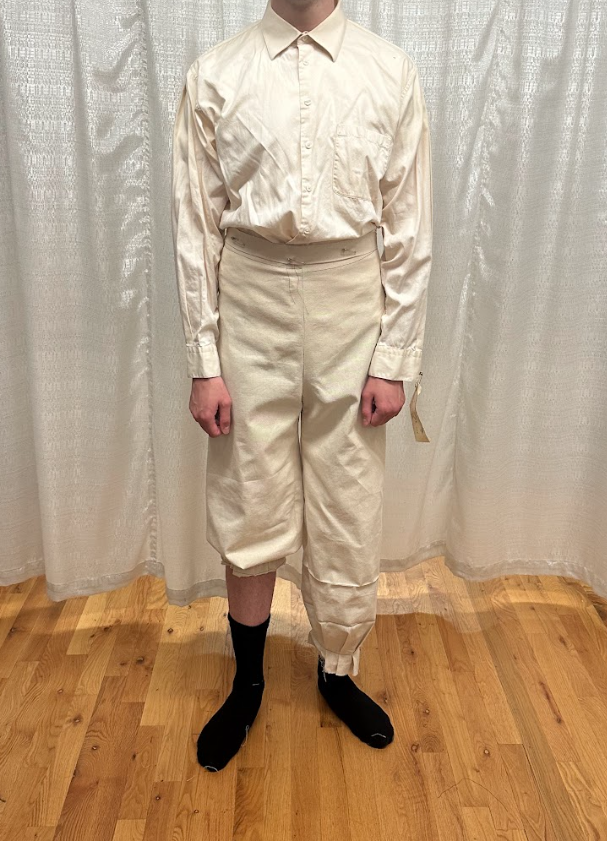 The plus fours were patterned with a pants block. A mock-up was made. Then, corrections to the pattern were made, and the fashion was cut. The pockets and fly were put in for the fashion fitting. The ends of the plus fours needed to be dropped, and the back needed to be brought out. Plackets and fake buckles were added, as this garment was a quick change.