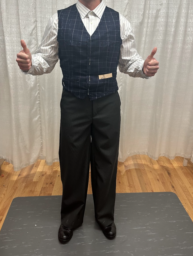 I patterned the pants and vest, then corrected the patterns and cut them out of the fashion fabrics. The zip fly and pockets were put on for the fitting, and corrections were applied again. The vest's shell was constructed for the second fitting, but the vest pockets were not put on as they had changed dramatically from the first fitting. Then, the two pieces were finished.
