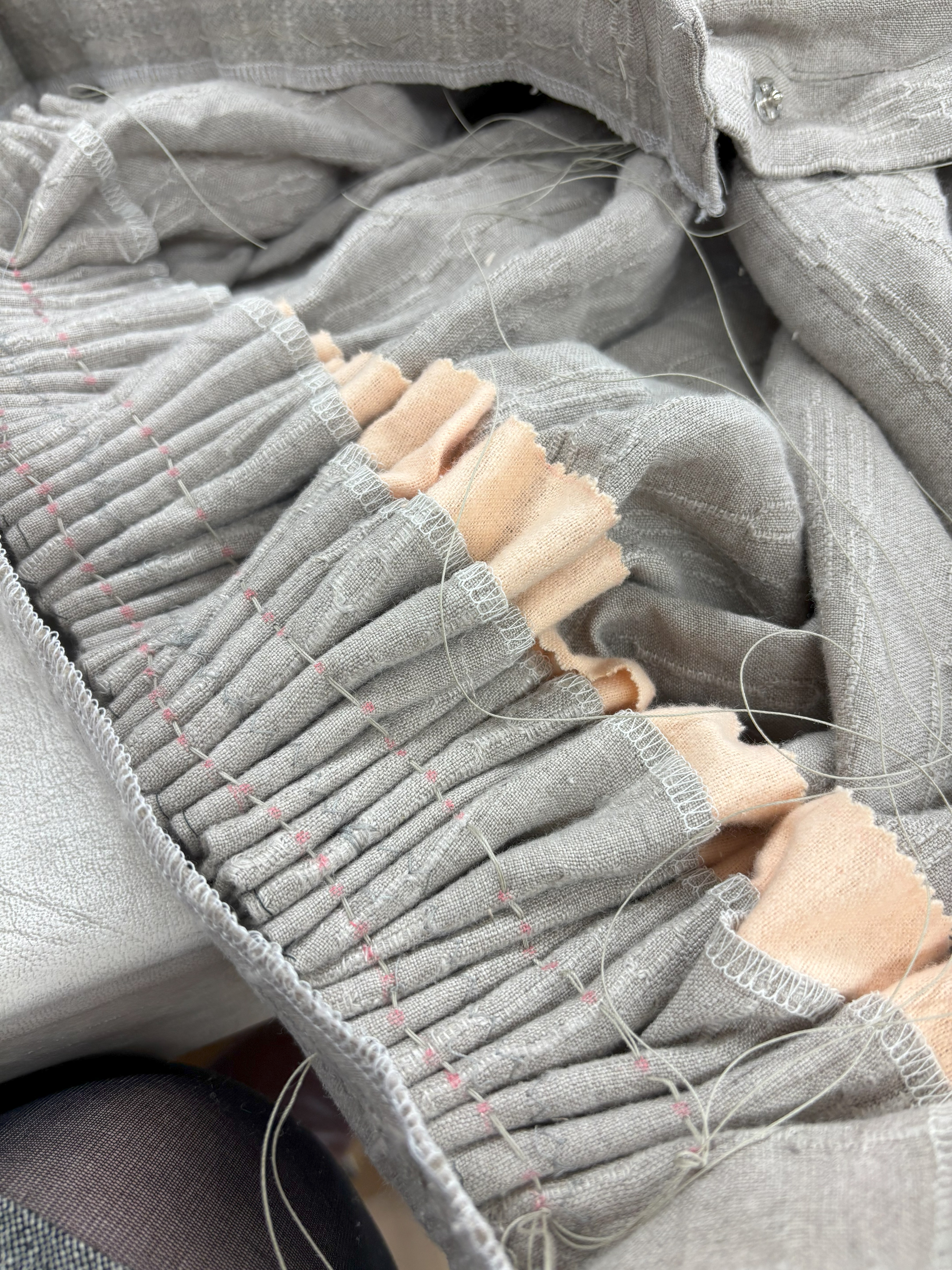 My role as a stitcher for the coat came in when most of it had been constructed, but there was a lot of finishing to do. I worked on the ease pleats at the bottom of the coat and worked on preparing and sewing the sequins. I learned a lot on how to work with sequins when working on this coat.
